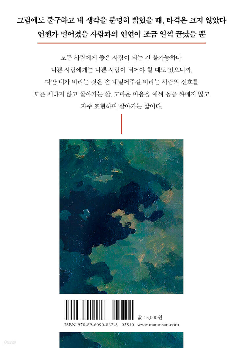 --- p.15 “여기서는 우리가 좋은 사람이 되는 것.” 나는 이 문장을 왼편 가슴에 새기고 싶다. 환대의 자리에서 우쭐해지지 않고자 함이고 내가 본 것들이 전부가 아님을 기억하기 위함이다. --- p.18~19 삶을 자주 성찰하고 글로 남긴다면 우리는 조금 더 괜찮은 사람이 될 수 있지 않을까, 막연히 짐작해본다. --- p.19 침묵하는 사람은 자유로울 수 없고 나와의 관계보다 더 소중한 관계는 없다. 나를 더 잘 돌보기 위해 침묵하지 않는 편을 택하고 싶다. --- p.30 자신의 호오를 정확히 인지하고 표현하는 사람과는 오랫동안 관계 맺고 싶다. --- p.31 ‘돌봄’이라는 단어는 해가 갈수록 더 많이 호명되고 있다. 미디어에서도 문학작품 속에서도 ‘돌봄’이라는 단어는 더 이상 낯설지 않다. 돌봄이 필수적인 신생아로 태어나 성인이 되어 돌봄을 제공하는 사람이 되고, 또 노인이 되어 다시 돌봄을 제공받기까지, 누구도 돌봄은 피해갈 수 없다. 마땅히 해야 할 일, 그러나 쉽지 않은 돌봄을 흔흔히 수행하는 엄마들을 포함한 모든 존재에게 말하고 싶다. 당신이 하는 일보다 위대한 일은 없다고. --- p.35~36 반응하는 사람이고 싶다. 상대의 수고와 노력을 알고 있다고 말해주는 사람이고 싶다. 그 마음 씀이 나에게도 상대에게도 너무나 절실한 요즘이다. --- p.43 오래 공들이고 마음을 다했지만 실패하는 일도 있고, 노력과 성공이 반드시 비례하지도 않는다는 사실을 이제는 안다. 그래서 나의 실패를 거리낌 없이 말하고 누군가의 실패담을 들을 때 함부로 평가하지 않는다. 적어도 실패했다는 건 시도를 했기 때문에 나온 결과니까, 그것만으로도 충분히 응원받아야 마땅한 일 아닐까. --- p.54 나의 장점을 정확하게 발견해주는 한 사람만 있어도 우리는 살아갈 힘을 낼 수 있다. --- p.70 상대의 시선에 눈을 맞추는 일은 관심 없이는 불가능하다. 존중 없이는 어렵다. 찰나의 눈 맞춤일지라도 우리는 느낄 수 있다. --- p.81~82 내내 조심하고 싶다. 선의와 호의의 덫에 걸려 무심코 조언이 툭 튀어나올 때, 과연 상대가 들을 마음의 준비가 되었는지, 내 선의를 보여주기 위한 목적이 더 크진 않은지. 어설픈 말들로부터 상대가 마음을 다치지 않도록, 조언을 건네는 일에는 계속 주저하고 싶다. --- p.92~93 말하는 사람이 되고 싶고, 말하는 타인을 응원하고 싶다. 불편한 언어와 행동을 지적하지 않고 사시사철 너그러운 표정을 지은 채 괜찮은 척 살고 싶지 않다. --- p.97 누군가를 초대하고 응답하는 일, 그 마음의 애씀이 얼마나 귀한 일인가. 상대를 환대하고 그 환대를 기꺼이 받고 또 고맙다고 인사하는 행위. 내가 참 좋아하는 이 일을 한동안 못해서 쓸쓸했구나, 다시 또 연결되는 기쁨을 누려야겠다고 생각한 밤이다. --- p.104 오싹하다. 서늘하다. 나의 실체를 보지 못한 사람들이 나를 고평가할까 봐. 부러 하소연도 쓰고, 못난 모습도 보인다. 잘 알지 못하면서 누군가를 좋아하고 누군가를 싫어하는 사람들을 보며, 나는 여전히 ‘잘 알고’ 좋아하고 싶은 욕망을 버리지 못하며 애면글면 살고 있다. --- p.115 매일 웃는 사람이라고 슬픔이 없지는 않다. 슬픔을 희석해 글로 표현하고 웃음으로 만드는 재주가 뛰어날 뿐. --- p.167~168 모든 감정이 엉켜서 폭발하기 직전의 사람에겐 어떤 명약이 필요할까? 바로 물어봐주는 것이다. 무엇 때문에 이토록 힘들어하냐고, 어떤 일이 당신을 그렇게 고통스럽게 만드느냐고 질문하는 사람이 필요하다. --- p.180 일부러 손해를 본다는 사람을 만난 적이 있다. 상대의 마음에 무엇이 있는지가 궁금하다는 사람. 그것을 알아내 품어주고 싶다는 사람. 쉽지 않겠지만 내가 정말 닮고 싶은 얼굴이었다. --- p.186 |