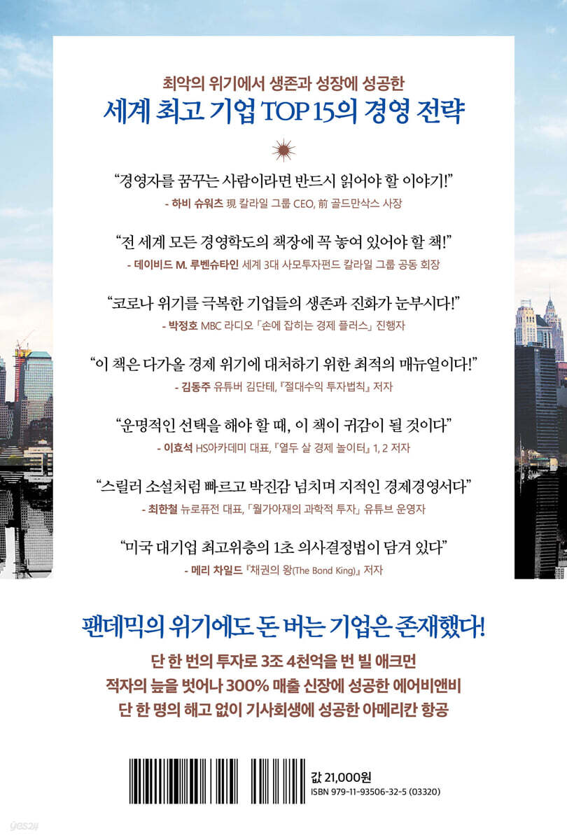 이제는 지난 이야기가 되었지만, 작년 이맘때를 돌이켜보면 코로나가 언제 끝날지 알 수 없어 힘들어했었죠. 승승장구하던 숙박업소와 여행사, 항공사 등이 줄도산했고 금융권과 각국 경제도 소행성이 떨어진 듯한 충격을 받았습니다. 그런데 멸종 위기까지 몰렸던 기업들이 사실 코로나가 기승을 부리던 와중에도 활로를 모색해 기사회생하고 성장까지 했었다는 사실을 이 책을 통해 알게 되었습니다. 이런 커다란 교훈은 아무 때고 얻을 수 있는 것이 아닙니다. 인류 문명사를 압축해서 전개한 듯한 지난 코로나 3년간의 글로벌 대기업 생존기는 이후로 다시 찾아올 경제 위기에 최고의 백신이 되어줄 것입니다. 이들의 처절한 생존과 눈부신 진화를 바로 지금 눈여겨봐야 할 이유입니다. - 박정호 (MBC 라디오 「손에 잡히는 경제 플러스」 진행자)