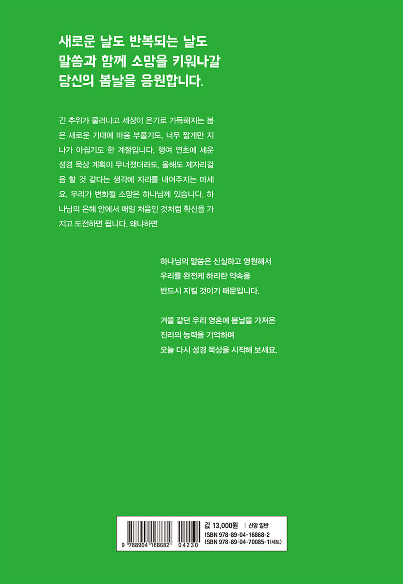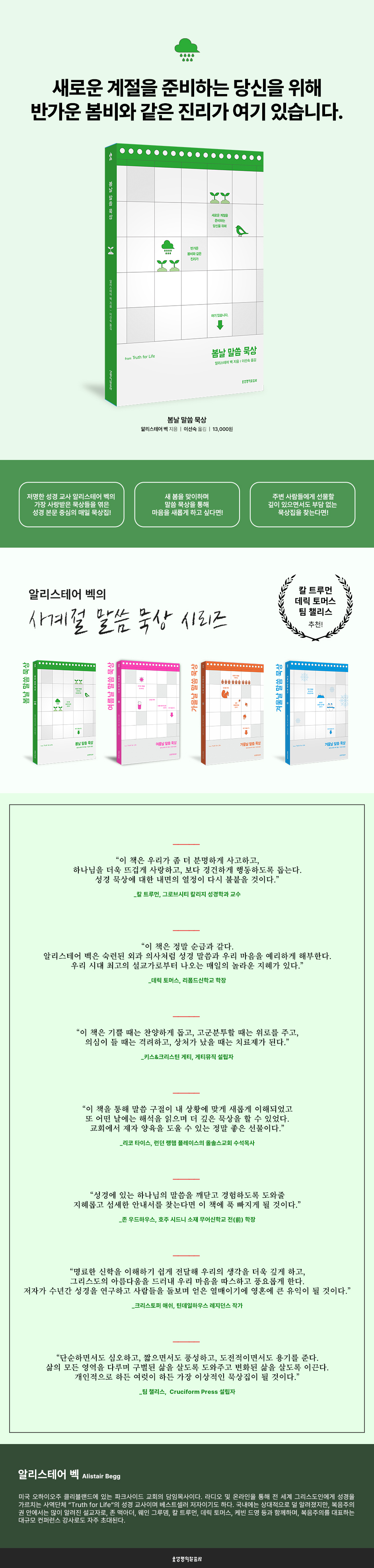 아래 세 가지 질문에 답해 보세요. - 하나님은 내가 어떻게 다르게 생각하기를 원하실까? - 하나님은 내 마음의 사랑이 어떻게 재정리되기 원하실까? - 하나님은 오늘 내가 무엇을 실천하기 원하실까? 매일 이 세 가지 질문에 모두 답할 수는 없겠지만, 꾸준히 질문을 던지다 보면 하나님께서 우리 삶에 대해 무어라 하시는지 우리의 생각과 마음이 열리게 됩니다. 또 그날 읽은 말씀으로 기도하는 데에도 큰 도움을 얻을 것입니다. 말씀이 삶으로 이어지는 깊이 있는 묵상을 하기 원한다면, 전 세계 그리스도인이 귀를 기울이는 성경 교사, 알리스테어 벡과 함께 묵상을 시작해 보세요. ※ 『가을날 말씀 묵상』은 알리스테어 벡의 사계절 말씀 묵상 시리즈, 『겨울날(출간예정) / 봄날(출간예정) / 여름날 말씀 묵상』으로 이어집니다. 추천합니다! 1. 성경 본문 중심의 매일 묵상집을 찾는 분 2. 새 봄을 맞아 말씀을 통해 마음을 새롭게 하고 싶은 분 3. 365 묵상집은 부담스러워서 그보다 짧은 기간 집중할 매일 묵상집을 찾는 분 4. 새신자 및 청장년에게 선물할 매일 묵상집을 찾는 분 |