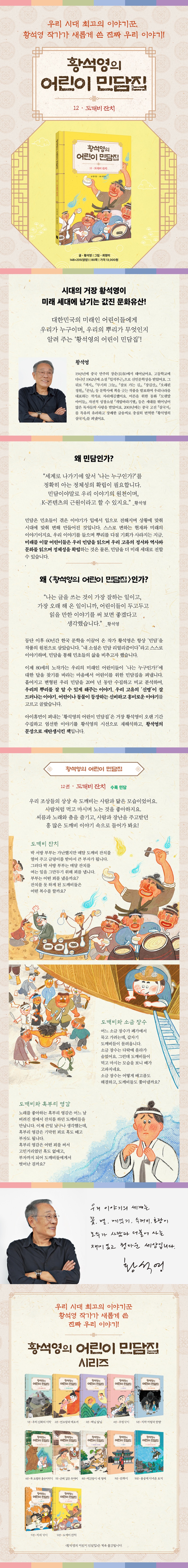 우리 정서를 흔히들 ‘한(限)’이라고 하지만, 우리 고유의 정서는 어떤 고난과 역경도 웃음으로 풀고 희망으로 삼는 ‘신명’입니다. 이 신명이 녹아 있는 우리 춤과 노래, 이야기는 격동의 역사와 함께 다양하게 발전했고, 지금의 콘텐츠 강국 대한민국을 만들었습니다. K-POP, K-콘텐츠로 대표되는 한국 문화의 뿌리가 바로 우리 이야기, 민담입니다. 그런데 최근 우리 민담이 설 자리가 점점 좁아지고 있습니다. 1970년대에 텔레비전을 시작으로 2010년대에는 스마트폰이 보급되고 OTT와 SNS 등 여러 오락거리가 늘어났고, 간단한 터치와 클릭만으로도 전 세계의 온갖 콘텐츠를 화면으로 만날 수 있게 되었습니다. 그만큼 우리 민담은 듣는 이도 전하는 이도 보기 어려워졌습니다. 그러나 세계가 하나 되는 시대인 만큼, ‘나’를 알고 방향을 잃지 않고 세계와 어울리는 것이, 이를 위해 우리 민담을 읽는 것이 더욱더 중요하다고 황석영 작가는 강조합니다. 민담을 읽는 것은 민초들이 쌓아 온 우리 역사와 문화, 정서를 읽으며 뿌리를 다지고 정체성을 확립하는 일이기도 하니까요. 황석영 작가는 어린이들이 자신이 누구인지 알고 세계로 나아갈 수 있도록, 민담이 미래로 전해질 수 있도록 우리 민담 복원에 나섰습니다. 그래서 “우리는 어디서 어떻게 시작되었지?”라는 어린이들의 궁금증에 답하는 『황석영의 어린이 민담집 1. 우리 신화의 시작』을 첫 권으로 내세워, 『황석영의 어린이 민담집』이라는 긴 여정을 출발했습니다. 시대의 거장이 어린이들에게 남기는 선물! 황석영 작가는 시대의 흐름에 따라 변형된 민담의 원래 이야기를 20여 년간 수집했습니다. 『한국 구비문학 대계』를 비롯하여 『한국 구전 설화』, 『대동야승』 등 다양한 시대에 다양한 관점으로 기록된 민담집들을 꼼꼼하게 탐색했습니다. 같은 내용이지만 지역마다 조금씩 다른 이야기들을 찾아 비교하는 작업도 거쳤습니다. 이렇게 수집한 많은 민담 가운데, 우리의 뿌리를 잘 알 수 있게 해주는 이야기, 우리 고유의 ‘신명’이 잘 드러나는 이야기, 어린이나 동물이 등장하는 신비하고 흥미로운 이야기를 고르고 골랐습니다. 아이휴먼이 펴내는 『황석영의 어린이 민담집』은 거장 황석영이 오랜 기간 수집하고 엄선한 이야기를 황석영의 시선과 문장으로 재탄생시킨 책입니다. 80세의 노작가가 그토록 아끼고 사랑했던 우리나라를 위해, 대한민국의 미래이자 머지않아 지구의 주역이 될 어린이들에게 마지막으로 주는 선물이 바로 『황석영의 어린이 민담집』입니다. 손때와 기억, 정이 만들어 낸 도깨비 사람이 오래 사용해서 손때와 정과 기억이 쌓이면 그 물건이 사람으로 변한다고 해요. 빗자루와 짚신, 비녀와 댕기, 망건, 뭐든 도깨비가 될 수 있습니다. 그런데 우리나라의 도깨비는 뿔도 달리고 온몸이 새빨간 무시무시한 모습이 아닙니다. 눈이나 코나 귀나 입이 좀 더 크거나 키가 작거나 클 뿐, 평범한 마을 사람들과 거의 다르지 않습니다. 그래서 어느 마을에서나 볼 수 있는 ‘김 서방’이란 호칭으로 도깨비들을 부르곤 했습니다. 도깨비들은 도깨비방망이를 가지고 다니며 금 나와라 뚝딱, 은 나와라 뚝딱 요술을 부립니다. 메밀묵과 막걸리를 즐겨 먹고, 춤추고 노래하며 떠들썩하게 노는 것도 좋아합니다. 사람과 씨름하고 어울리는 것을 즐기는가 하면 사람들을 골탕 먹이거나 반대로 골탕을 먹기도 합니다. 도깨비란 존재는 우리 조상들과 아주 가까운 사이였지요. 영리한 꾀로 도깨비를 물리친 부부와 쉽게 속아 넘어가는 도깨비들의 순수하면서도 우스꽝스러운 이야기도 있고, 잔치를 열다가 정체 모를 소리에 놀라 소중한 도깨비방망이도 두고 달아나는 도깨비들도 있고, 재치 있게 도깨비들을 고민도 해결하고 부자도 된 영감님과 욕심을 부리다가 고민이 두 배가 되어 버린 사람 이야기도 있습니다. 사람과 가깝게 어울리는 도깨비들의 이야기를 모은 『황석영의 어린이 민담집 12. 도깨비 잔치치』에서 우리는 순수하고 유쾌한 우리 조상들의 친구들을 만나볼 수 있습니다. |