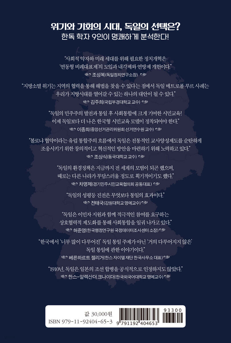 위기와 기회의 시대, 독일의 선택은? 한독 학자 9인이 명쾌하게 해석한다! “사회적 약자와 미래 세대를 위해 필요한 정치개혁은 ‘연동형 비례대표제’의 도입과 내각제와 연방제 개헌이다.” “지방소멸 위기는 지역의 협력을 통해 해법을 찾을 수 있다는 점에서 독일 메트로폴 루르 사례는 우리가 지방시대를 열어갈 수 있는 하나의 대안이 될 수 있다.” “독일의 민주주의 발전과 통일 후 사회통합에 크게 기여한 시민교육! 이제 독일보다 더 나은 한국형 시민교육 모델이 정착되어야 한다.” “볼로냐 협약이라는 유럽 통합주의 흐름에서 독일은 전통적인 교사양성제도를 순탄하게 조응시키기 위한 창의적이고 혁신적인 방안을 마련하기 위해 노력하고 있다.” “독일의 환경정책은 지금까지 전 세계의 모범이 되곤 했으며, 때로는 다른 나라가 부담스러울 정도로 획기적이기도 했다.” “독일의 성평등 진전은 무엇보다 통일의 효과이다.” “독일은 이민자 지원과 함께 적극적인 참여를 요구하는 상호협력적 제도화를 통해 사회통합을 일궈 나가고 있다.” “한국에서 ‘너무 많이 다루어진’ 독일 통일 주제가 아닌 ‘거의 다루어지지 않은’ 독일 통일에 관한 이야기이다.” “1910년, 독일은 일본의 조선 합병을 공식적으로 인정하지도 않았다.” 대전환의 시대, 독일의 제도와 정책으로 한국을 들여다보다! 2023년은 한국과 독일이 수교를 맺고 협력적 동반자의 길을 걸어온 지 140주년이 되는 해이다. 이처럼 특별한 의미를 지니는 해를 기념하기 위하여 독일에서 학문을 닦은 국내 학자들과 독일의 학자들이 공동으로 한 권의 단행본을 출간했다. 『대전환의 시대, 독일의 제도와 정책』은 9명의 독일 전문가들이 정치·사회·환경·통일 등 독일 사회의 면면을 분석적으로 들여다본 후 대전환 에 대응하는 한국 사회를 위한 시사점을 제시한다. 제1장 『선거제도와 정치제도 개혁』에서는 "왜 정치제도와 선거제도를 바꿔야 하는가?" 하는 질문을 던지고 있다. 그것은 우리 사회의 중요한 문제들이 풀리지 않고 방치되고 있기 때문이고, 또 문제해결의 주체인 정치가 제대로 작동하지 않고 있기 때문이다. 그 제도를 어떻게 바꿔야 하는지에 대해 독일 사례를 통해 대안을 제시하고 있다. 제2장 『새로운 베를린을 꿈꾸는 메트로폴 루르: 지역연합 형성을 통한 지역발전』에서는 인구감소와 수도권 쏠림으로 인한 지방소멸 위기는 지역의 협력을 통해 해법을 찾을 수 있다는 점에서 독일 메트로폴 루르 사례는 우리가 지방시대를 열어갈 수 있는 하나의 대안이 될 수 있다고 분석한다. 제3장 『독일의 시민교육』에서는 독일의 민주주의 발전과 통일 후 사회통합에 크게 기여한 독일 시민교육의 체계, 주요 주체 등을 고찰한 후, 독일 시민교육의 대표적 사례들을 중점적으로 살펴보고 우리나라에 주는 함의를 모색한다. 제4장 『독일 초·중등교원양성제도의 현황과 개혁 동향: 쟁점과 시사점』에서는 최근까지 많은 변화를 겪고 있는 독일 교원양성제도의 현황을 기술하고, 독일 교원양성제도의 기본구조가 확립되는 역사적 과정을 몇 가지 전환점으로 구분하여 개혁의 내용과 그 주요 원인을 서술하고, 아직 국내에 소개되지 않았으면서 앞으로 독일 교원양성제도에 큰 영향을 줄 수 있는 최근의 개혁 흐름, 교원양성제도의 개혁을 둘러싼 쟁점과 우리나라에 주는 시사점에 관해 논한다. 제5장 『독일의 환경정책: 환경규제와 경제정책의 공존』에서는 일반적으로 환경규제와 경제발전은 양립하지 못하는 것으로 인식하고 있으나, 독일은 환경규제와 산업발전이 공존할 수 있는 사례를 세계에 보여주고 있음을 고찰한다. 이 장에서는 독일 환경정책의 역사, 환경 우선주의적 관점에서 실행되고 있는 경제정책, 연정 합의서의 환경과 경제정책의 구체적인 내용을 다루고 있다. 제6장 『독일 통일과 성평등의 전진』에서는 통일 후 독일에서 일어난 성평등의 진전을 통일 전의 동-서독의 상태와 비교하여 그 특징을 파악한다. 일과 가정의 양립을 가능하게 한 통일 전 동독의 잘 구축된 전국적 아동돌봄 체계와 높은 여성 취업률이 통일 후 서독지역을 자극하여 서독에서도 돌봄체계가 확충되고 여성의 취업률도 높아지며, 서독인들의 전통적인 성 역할 의식에 커다란 변화가 일어났음을 분석하고 우리에게 주는 함의를 도출한다. 제7장 『독일의 이민행정』에서는 우리나라와 유사하게 단일혈통 중심의 외국인 관리 정책을 오랫동안 견지해 오다 비교적 최근 개방적인 이민정책으로 변모한 독일 이민행정의 역사적 맥락과 환경 변화를 고찰하고 이민행정체계의 구조와 운영에 관해 사례를 들어 분석한 후, 우리나라에 주는 시사점을 모색한다. 제8장 『독일의 통일 정책과 독일 통일: 한국을 위한 교훈은 여전히 존재하는가?』에서는 기존의 독일 통일을 주제로 한 연구들이 많이 다루지 않았던 독일 분단의 역사와 통일 과정의 국가와 민간의 역할에 관해 분석한다. 제9장 『한-독 수교 140년: 그 기원에 대한 회고』에서는 독일과 조선 수교 초기 단계를 중심으로 그동안의 양국 관계의 역사를 주요 인물들을 바탕