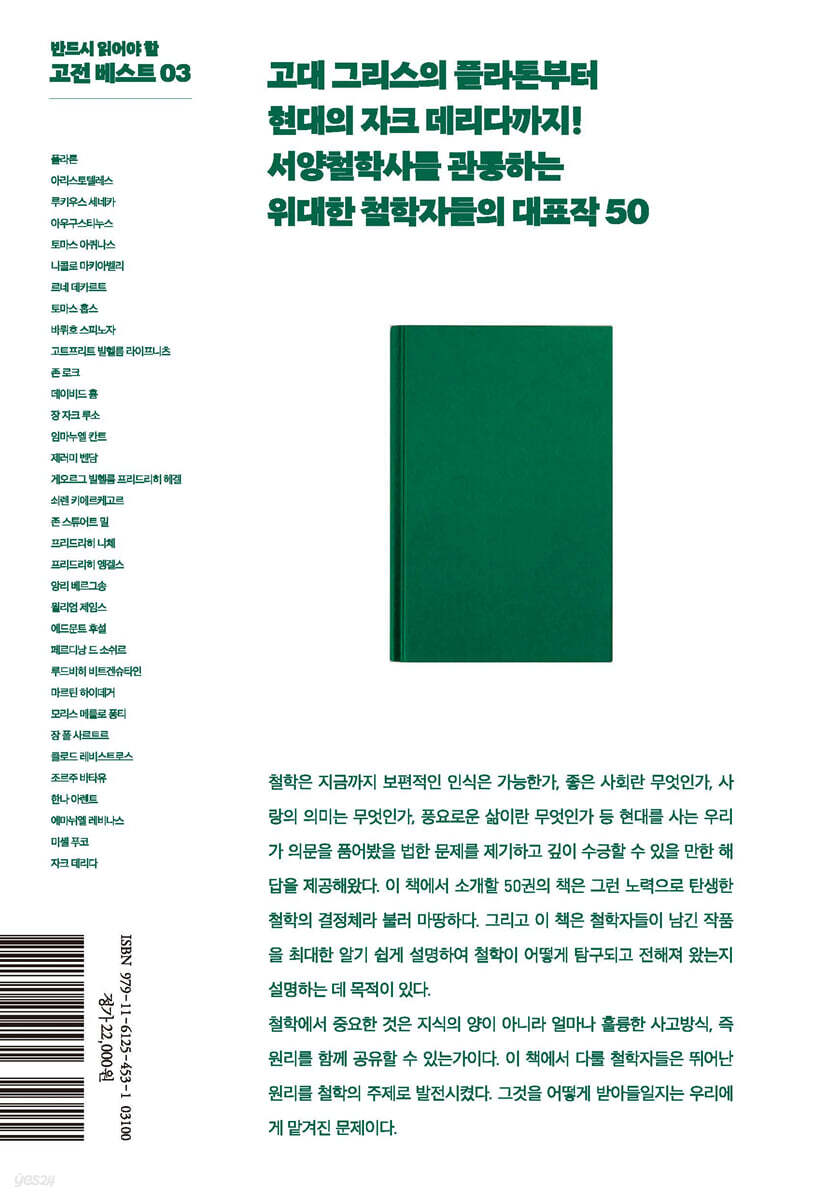 철학서를 읽기 전에 알아두어야 할 다섯 가지 마음가짐 1장 고대 그리스 ― 종교에서 벗어나 개념으로 세계를 설명하다 1 플라톤 『소크라테스의 변론』 ― 잘 살기 위한 철학 2 플라톤 『향연』 ― 사랑에 관한 훌륭한 통찰 3 플라톤 『파이드로스』 ― 사랑과 공통 이해의 본질론 4 플라톤 『국가』 ― 정의란 무엇인가를 둘러싼 대화 5 아리스토텔레스 『형이상학』 ― 세계의 원리를 개념적으로 명확히 하려는 시도 6 아리스토텔레스 『정치학』 ― 인간 본성으로서의 정치를 조명하다 2장 중세 ― 기독교 신학에 지배당한 철학 7 루키우스 세네카 『인생의 짧음에 관하여』 ― 충실한 인생을 위한 조건은 무엇인가 8 아우구스티누스 『고백록』 ― 자기를 드러내고 신앙의 희망을 전하다 9 토마스 아퀴나스 『신학대전』 ― 신앙의 정당함은 논증할 수 있는가 10 니콜로 마키아벨리 『군주론』 ― 조국 통일을 꿈꾼 현실주의자의 책 3장 근대 ― 보편성을 탐구하다 11 르네 데카르트 『방법서설』 ― 근대 철학 선언 12 르네 데카르트 『정념론』 ― 정념의 의미를 설명하다 13 토마스 홉스 『리바이어던』 ― 시민 국가의 시대를 개척하다 1 14 바뤼흐 스피노자 『에티카』 ― 선의 근거를 수학적으로 도출한 윤리학 15 고트프리트 빌헬름 라이프니츠 『단자론』 ― 기독교를 대신하는 조화의 원리를 추구하다 16 존 로크 『인간 지성론』 ― 확실한 것은 지각 경험뿐이다 17 존 로크 『시민정부론』 ― 미국 독립혁명에 영향을 준 철학 18 데이비드 흄 『인간이란 무엇인가』 ― 모든 인식은 지각의 묶음이다 19 장 자크 루소 『인간 불평등 기원론』 ― 인간 사회에 불평등이 발생하는 이유를 묻다 20 장 자크 루소 『사회계약론』 ― 근대사회, 근대국가의 정당성의 원리를 확립하다 21 임마누엘 칸트 『순수이성비판』 ― 색안경의 인식론 22 임마누엘 칸트 『실천이성비판』 ― 도덕의 근거를 이성에 두다 23 제러미 벤담 『도덕과 입법의 원리 서설』 ― 공리주의의 원리를 확립하다 24 게오르그 빌헬름 프리드리히 헤겔 『법철학』 ― 인간적 자유의 원리론 25 쇠렌 키에르케고르 『죽음에 이르는 병』 ― 실존철학을 창시하다 26 존 스튜어트 밀 『공리주의』 ― 도덕의 근거로 행복을 제시하다 27 존 스튜어트 밀 『자유론』 ― 행복의 조건으로서 자유를 설명하다 4장 현대 I ― 니체부터 하이데거까지 28 프리드리히 니체 『비극의 탄생』 ― 삶에 대한 긍정을 설명하는 니체의 데뷔작 29 프리드리히 니체 『도덕의 계보』 ― 도덕의 가치를 묻다 30 프리드리히 니체 『권력에의 의지』 ― 인식 원리를 근본적으로 전환하다 31 프리드리히 엥겔스 『공상에서 과학으로』 ― 마르크스주의의 전체상 32 앙리 베르그송 『의식에 직접 주어진 것들에 관한 시론』 ― 의식은 질이다 33 윌리엄 제임스 『실용주의』 ― 진리는 작용하는 것이다 34 에드문트 후설 『현상학의 이념』 ― 인식 문제를 해명하는 원리를 제시하다 35 에드문트 후설 『순수 현상학과 현상학적 철학의 이념들』 ― 인식의 본질론으로서의 현상학을 확립하다 36 페르디낭 드 소쉬르 『일반언어학 강의』 ― 근대 언어학을 창시하다 37 루드비히 비트겐슈타인 『논리철학논고』 ― 우리는 무엇을 말할 수 있는가 38 루드비히 비트겐슈타인 『철학적 탐구』 ― 말의 의미는 그 사용에 달려 있다 39 마르틴 하이데거 『존재와 시간』 ― 실존철학의 최고봉 40 마르틴 하이데거 『형이상학입문』 ― 후기 하이데거 입문서 5장 현대 II ― 메를로 퐁티부터 자크 데리다까지 41 모리스 메를로 퐁티 『행동의 구조』 ― 행동의 의미는 무엇인가 42 모리스 메를로 퐁티 『지각의 현상학』 ― 신체의 의미를 명확히 하다 43 장 폴 사르트르 『존재와 무』 ― 절대적 자유의 윤리학 44 클로드 레비스트로스 『슬픈 열대』 ― 문화인류학의 바이블 45 조르주 바타유 『에로티시즘』 ― 에로티시즘의 본질론 46 한나 아렌트 『인간의 조건』 ― 근대사회가 노동 사회로 전개되는 것을 비판하다 47 한나 아렌트 『혁명론』 ― 자유는 공적 공간을 필요로 한다 48 에마뉘엘 레비나스 『전체성과 무한』 ― 윤리의 조건은 나의 내부에 있다 49 미셸 푸코 『말과 사물』 ― 포스트모던 사상의 대표작 50 자크 데리다 『목소리와 현상』 ― 동일성을 해체하는 탈구축의 사상 |