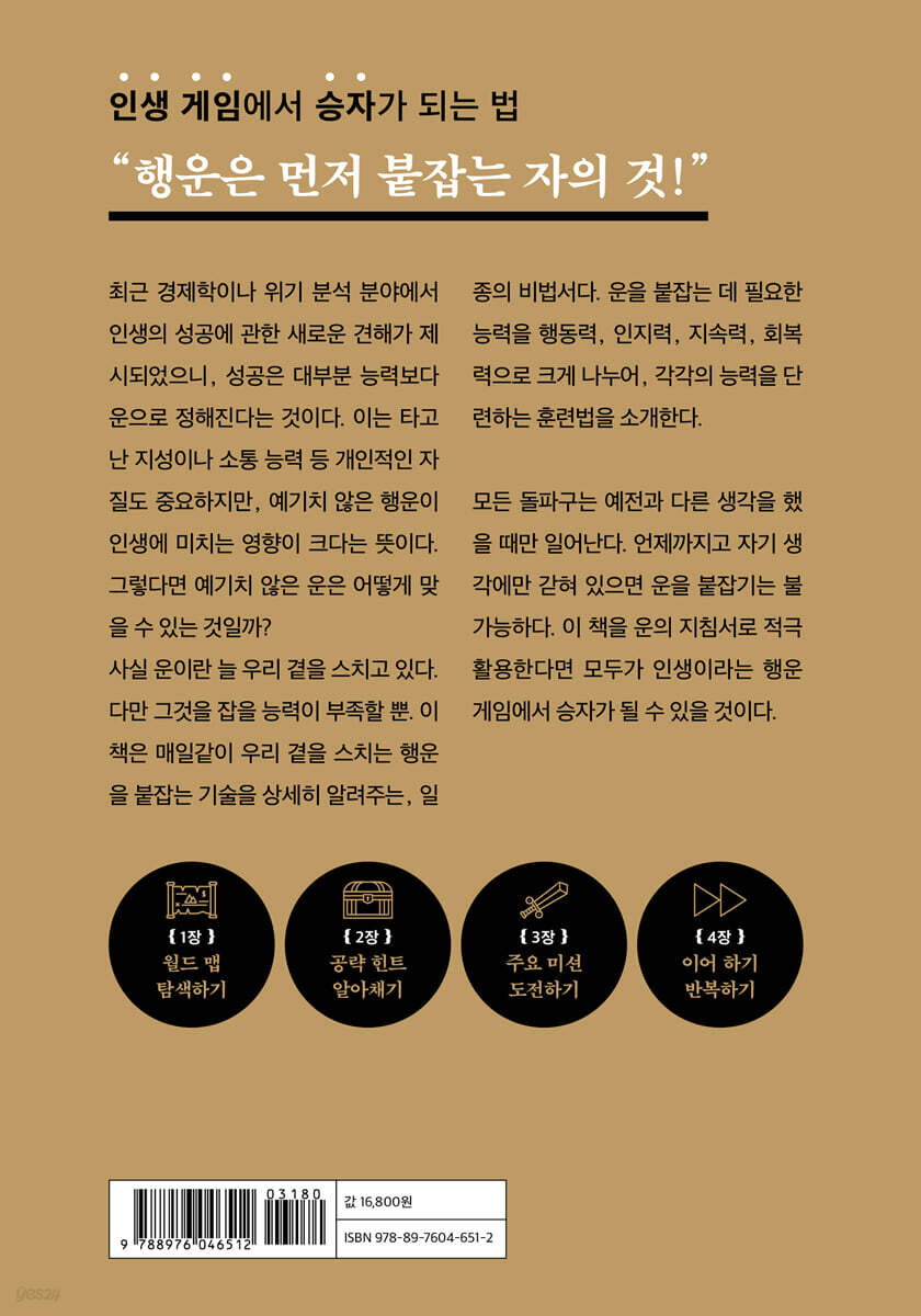 이 책은 이 공식에 맞추어 운을 붙잡기 위한 기술 향상법을 알려준다. 운을 붙잡는 데 필요한 능력을 행동력, 인지력, 지속력, 회복력으로 크게 나누어서, 각각의 능력을 단련하는 훈련법을 소개한다. 1장에서 키운 행동력, 2장에서 습득한 인지력, 3장에서 기른 지속력, 4장에서 단련한 회복력을 모두 조합하면 독자들 삶에는 행운의 연쇄가 일어날 확률이 크게 높아진다. 모든 돌파구는 예전과 다른 생각을 했을 때만 일어난다. 언제까지고 자기 생각에만 갇혀 있으면 운을 붙잡기는 불가능하다. 이 책을 운의 지침서로 적극 활용한다면 모두가 인생이라는 행운 게임에서 승자가 될 수 있을 것이다. 과학으로 증명된 ‘운칠기삼’ 행운은 찾는 자에게만 달려온다! 주위를 둘러보면 세상은 ‘도저히 어찌할 수 없는 운’으로 넘쳐난다. 예를 들면 수입의 절반은 태어난 국가로 결정되고, 수입과 만족도는 외모의 영향을 받으며, 수입과 지위는 타고난 수학 실력으로 결정되고, 지위에는 태어난 달이 영향을 미치며, 이름이 인생 성공에 영향을 미친다. 이 모든 사실이 데이터로 증명되었다. 이 밖에도 성격이나 운동신경, 부모의 학력 등 성공을 좌우하는 수많은 운의 종류를 들자면 끝이 없다. 역시 인생은 행운 게임이라고 할만하다. 최근에는 주로 경제학이나 위기 분석 분야에서 인생의 성공에 관한 새로운 견해가 제시되었다. 성공은 대부분 능력보다 운으로 정해진다는 것이다. 이는 타고난 지성이나 소통 능력 등 개인적인 자질도 중요하지만, 예기치 않은 행운이 인생에 미치는 영향이 크다는 뜻이다. 확실히 ‘운칠기삼’은 존재하는 것이다. 그런데 그 대단한 ‘운’이 사실 늘 우리 곁을 스치고 있다면? 우리에겐 다만 그것을 잡을 능력이 부족할 뿐이라면? 이 책은 매일같이 우리 곁을 스치는 행운을 붙잡는 기술을 상세히 알려주는, 일종의 비법서다. 운을 붙잡는 데 필요한 능력을 단련시켜주는 것이다. 헤지펀드 운용으로 125억 달러(약 12조 원) 이상의 자산을 얻은 제임스 사이먼스는 자신의 성공 비결에 대해 이렇게 설명했다. “독창적으로 일해야 한다. 무리를 따르면 안 된다. 최고의 비결은 행운을 기원하는 것, 그것이 가장 중요하다.” 물리학자인 스티븐 호킹은 과거에 몇 번이나 위대한 발견이 가능했던 이유가 무엇이냐는 질문에 이렇게 대답했다. “나는 자라지 않는 아이일 뿐이다. 나는 아직도 어떻게, 왜를 계속 질문하고 있고 가끔 답을 확인한다.” 행운을 얻기 위해서뿐 아니라 인생을 훨씬 즐겁게 보내기 위해서라도 내면에 호기심을 장착하고 운을 잡기 위한 노력을 끊임없이 지속해야 한다. 이 책과 함께 훈련한 행운 스킬이 분명 독자들의 운을 상승시킬 뿐만 아니라 삶의 질 자체를 높여줄 것이다. |