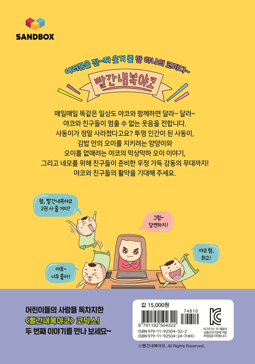 사랑할 수밖에 없는 ‘빨간내복야코’ 한 번도 안 본 사람은 있어도 한 번만 본 사람은 없다! 유튜브 채널 ‘빨간내복야코’는 익살맞고 예측 불가능한 캐릭터들에 중독성 강한 노래를 더한 애니메이션으로 92만이라는 구독자들에게 많은 지지와 사랑을 받고 있습니다. 우리를 웃게 하는 유쾌 발랄 캐릭터들의 대활약! 어디로 튈지 모르는 장난꾸러기지만, 친구들에게 문제가 생기면 진지하고 속 깊은 행동을 보여 주는 야코! 야코의 매력이 어디까지인지 함께 빠져 볼까요? 2권에서는 새로운 캐릭터인 네모와 백설이가 등장합니다. 긍정적인 성격에 특유의 기분 좋은 웃음소리를 내는 네모와 활발한 성격으로 자신감 넘치는 백설이! 네모와 백설이의 활약도 기대해 주세요~ 영상에는 없다, 오직 코믹스에만 있다! 야코와 친구들의 새로운 이야기~ 『빨간내복야코』 2권은 ‘빨간내복야코’ 채널에서 인기 있는 영상인 ‘투명 인간이 된 사동이’, ‘오이 싫어! 오이 좋아!’, ‘다이어트 방해 작전’, ‘이 옷 어때?’, ‘비상이다! 비상!’을 만화로 구성했어요. 그리고 오직 코믹스에서만 만날 수 있는 새로운 에피소드도 선보입니다. ‘하몽이의 복수?!’에서는 하몽이가 소중하게 키운 꽃밭을 계속해서 엉망으로 만드는 야코에게 하몽이가 복수를 계획하는 이야기가 그려져요. ‘스포키의 지구를 지켜라!’ 편은 지구를 향해 날아오는 운석을 막기 위해 스포키가 고군분투하는 이야기로, 과학자인 스포키의 멋진 모습을 기대해도 좋아요. 그 외에도 ‘원바와 핫도그’, ‘사랑에 빠진 사동이’, ‘네모의 꿈’ 등 제목만 봐도 기대되는 이야기 10편을 만나 보세요~ 이걸 어떻게 골라~ 재미있는 밸런스 게임과 공룡이 멸종된 이유는? 등 놀이 뿐 아니라 유익한 정보도 볼 수 있는 쉬어 가는 페이지 『빨간내복야코』 2권에서는 ‘밸런스 게임’, ‘핫도그를 든 원바 찾기’, ‘공룡이 멸종된 이유’, ‘짝사랑은 어려워’ 등 배꼽 잡고 웃으며 만화를 읽은 뒤 잠시 숨을 고를 수 있는 쉬어 가는 페이지와 네모와 백설이, 사동이의 소개가 수록되어 있어요. 만화만큼이나 쉬어 가는 페이지도 꿀잼이니 놓치지 마세요~ |