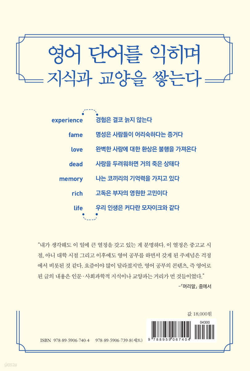 제1장 창의성·경험·행동 창의성에는 땀과 피가 필요하다 creative · 15 경험은 결코 늙지 않는다 experience · 23 오늘부터 당신 자신이 브랜드다 brand · 29 우리는 먼저 생각하고 나중에 행동할 수 없다 action · 35 바꿔라, 그러면서 바꾸지 마라 change · 42 제2장 야망·명성·성공 야망과 불만은 동전의 양면이다 ambition · 51 명성은 사람들이 어리숙하다는 증거다 fame · 58 셀럽은 우리 시대의 종교다 celebrity · 63 성공처럼 좋은 살균제는 없다 success · 70 이전보다 더 낫게 실패하라 fail · 77 제3장 사랑·결혼·죽음 완벽한 사랑에 대한 환상은 불행을 가져온다 love · 87 결혼이 불평등을 키운다 marry · 93 사랑을 두려워하면 거의 죽은 상태다 dead · 99 가을은 떨어지는 계절이다 fall · 104 당신은 나의 세계예요 world · 109 제4장 두려움·배신·책임 사랑보다는 두려움의 대상이 되는 게 안전하다 fear · 117 배신의 상처는 동물과 자연을 사랑하게 만든다 betray · 123 왜 “사람 좋으면 꼴찌”라고 하는가? nice · 128 ‘미안하다’가 가장 하기 힘든 말인 것 같아요 sorry · 133 메아 쿨파, 메아 쿨파, 메아 막시마 쿨파! blame · 137 제5장 기억·위험·꿈 나는 코끼리의 기억력을 가지고 있다 memory · 145 위험에 대한 미국과 유럽의 시각 차이 risk · 152 단순함은 복잡함보다 더 어렵다 simple · 158 함께 꾸는 꿈은 현실이 될 수 있다 dream · 164 방향을 결정하는 건 바람이 아니라 돛이다 wind · 170 제6장 계급·역사·돈 인류 역사는 계급투쟁의 역사인가? class · 177 역사란 죽은 자를 이용해 벌이는 장난인가? history · 183 돈이 없는 게 만악의 근원이다 money · 188 고독은 부자의 영원한 고민이다 rich · 194 “어려서 고생은 사서도 한다”는 말은 헛소리다 adversity · 199 제7장 행복·인생·법 누가 행복을 정의할 수 있는가? happiness · 209 우리 인생은 커다란 모자이크와 같다 life · 215 사람 사는 게 다 그런 겁니다 way · 221 법은 거미줄과 같다 law · 226 책은 도끼가 아니다 book · 232 주 · 238 |
