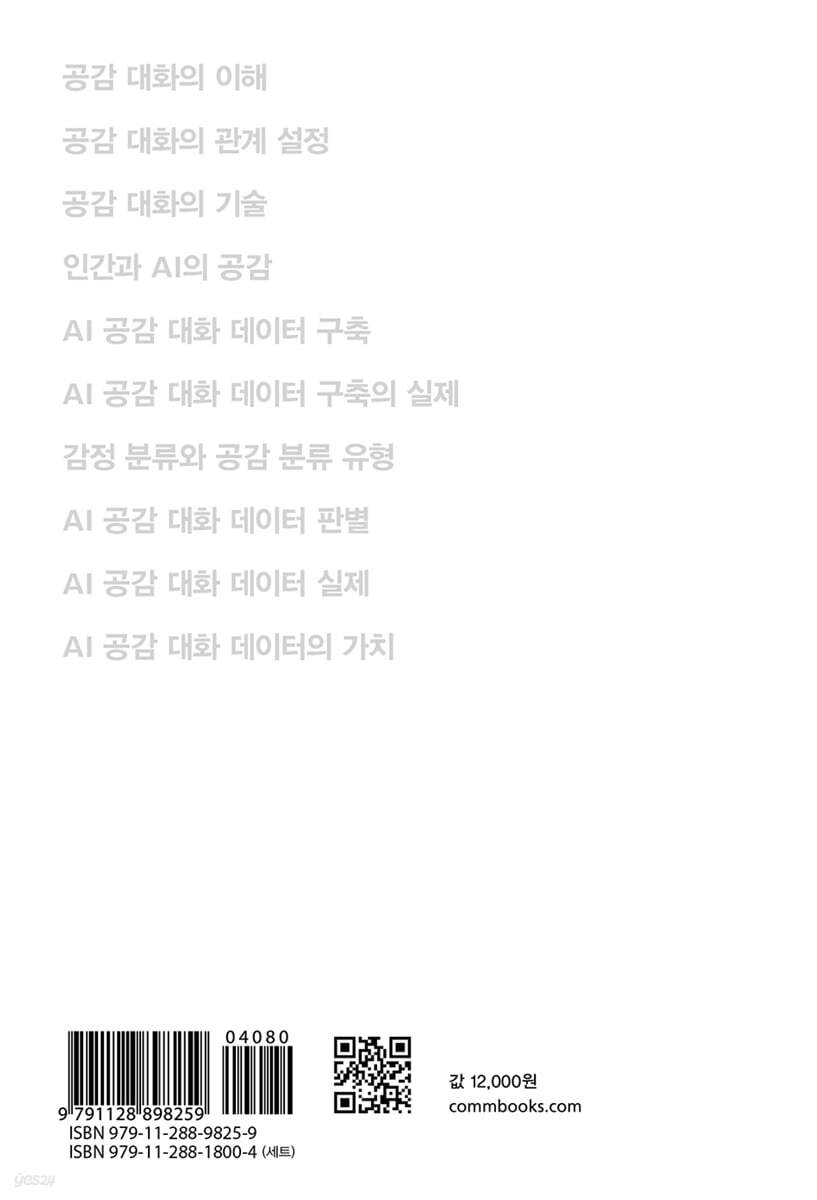 01 공감 대화의 이해 02 공감 대화의 관계 설정 03 공감 대화의 기술 04 인간과 AI의 공감 05 AI 공감 대화 데이터 구축 06 AI 공감 대화 데이터 구축의 실제 07 감정 분류와 공감 분류 유형 08 AI 공감 대화 데이터 판별 09 AI 공감 대화 데이터 실제 10 AI 공감 대화 데이터의 가치 |