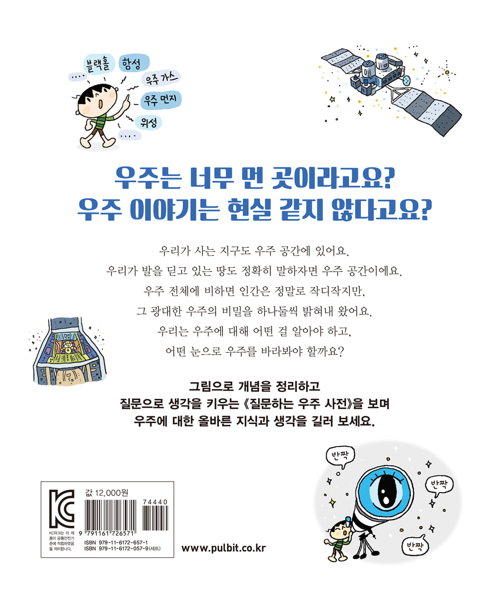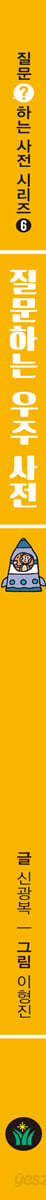 《질문하는 사전 시리즈》 여섯 번째 권인 『질문하는 우주 사전』은 우주에 대한 궁금증을 풀고, 우주에 대한 올바른 생각을 기르는 데 도움을 주기 위한 책이에요. ‘지구와 달, 태양계’, ‘별과 은하, 우주 공간’, ‘우주를 이해하려는 인간의 노력’, ‘우주로 나가려는 인간의 도전’ 등 모두 4개의 장으로 나뉘어 있어요. 1. 지구와 달, 태양계 지구는 평범하지만 특별해요. 지구는 우주에 엄청나게 많은 행성 중 하나지만, 생물이 살고 있어서 특별하지요. 이런 지구가 속해 있는 태양계에는 어떤 천체들이 있을까요? 그리고 태양계는 얼마나 클까요? 2. 별과 은하, 우주 공간 밤하늘은 별의별 일이 다 벌어지는 역동적인 곳이에요. 밤하늘에는 다양한 나이, 다양한 크기 그리고 다양한 색깔의 별들이 있지요. 별들도 태어나고 죽는답니다. 우주에는 얼마나 많은 별이 있을까요? 3. 우주를 이해하려는 인간의 노력 오랜 옛날부터 사람들은 관측과 계산만을 통해서 우주에 대한 많은 것들을 알아냈어요. 우주의 모양과 질서, 즉 우주관을 만들었지요. 옛날 사람들이 생각한 우주는 어땠을까요? 우주에 대한 지식은 어떻게 얻었을까요? 4. 우주로 나가려는 인간의 도전 물체가 지구를 떠나 우주 공간으로 나가려면 엄청난 속도를 내는 로켓과 발사대와 발사기지가 필요해요. 인간은 우주로 나가기 위해 어떤 노력을 해 왔을까요? 우주 시대에 우리는 어떤 것을 조심해야 할까요? 그림으로 개념을 정리하고 질문으로 생각을 키워요 《질문하는 사전 시리즈》는 교과서에 나오는 다양한 분야의 개념을 그림으로 정리하고, 질문으로 생각을 키우는 어린이 지식 정보 시리즈예요. 교과서에 나오는 개념들을 억지로 주입하지 않고 어린이 스스로 생각해 볼 수 있도록 꾸몄어요. 만화처럼 재밌고 가벼운 그림이 어린이들의 흥미를 끌면서도 깊이 있는 주제와 생각을 키워 주는 내용으로 큰 인기를 얻고 있답니다. 시리즈 첫 번째 책은 환경, 두 번째 책은 경제, 세 번째 책은 법, 네 번째 책은 인권, 다섯 번째 책은 정치, 여섯 번째 책은 우주예요. 인간은 오래 전부터 우주에 대해 알기 위해 노력해 왔어요. 여전히 우주는 관측의 대상이지요. 우주 전체의 질서는 인간이 손댈 수 있는 영역이 아니지만, 이제는 우주를 알고 우주로 나가려면 인간이 만든 질서, 즉 경제와 정치, 윤리에 대한 고민을 꼭 해야만 해요. 왜냐하면 요즘의 우주 과학 연구에는 아주 큰 돈이 들고, 그 정도의 돈은 대기업과 정부가 아니면 마련할 수가 없으니까요. 이처럼 세상의 모든 지식은 인간 및 사회의 노력과 떼려야 뗄 수 없는 관계에 있어요. 그런 만큼, 이 책을 읽는 여러분은 우주 지식 하나를 알게 될 때마다 그 뒤에 숨은 ‘인간’에 대해서도 읽어 내길 바라요. 인간이 우주를 어떤 눈으로 보았기에 그 지식을 알게 되었는지, 그것을 알기까지 어떤 경쟁이 있었는지, 누가 어떤 희생을 했고 그와 관련하여 우리는 어떤 윤리적 입장을 지녀야 할 것인지까지 속속들이 궁금해하길 바라요. 그렇게 질문할 수 있는 모든 것을 질문하면서 우주 지식을 익혀 간다면, 우주는 물론이고 여러분을 둘러싸고 있는 이 세상까지 완전히 새롭게 보이게 될 거예요. 질문하는 사전 시리즈 구성 1권 질문하는 환경 사전 / 2권 질문하는 경제 사전 / 3권 질문하는 법 사전 / 4권 질문하는 인권 사전 5권 질문하는 정치 사전 / 6권 질문하는 우주 사전 |