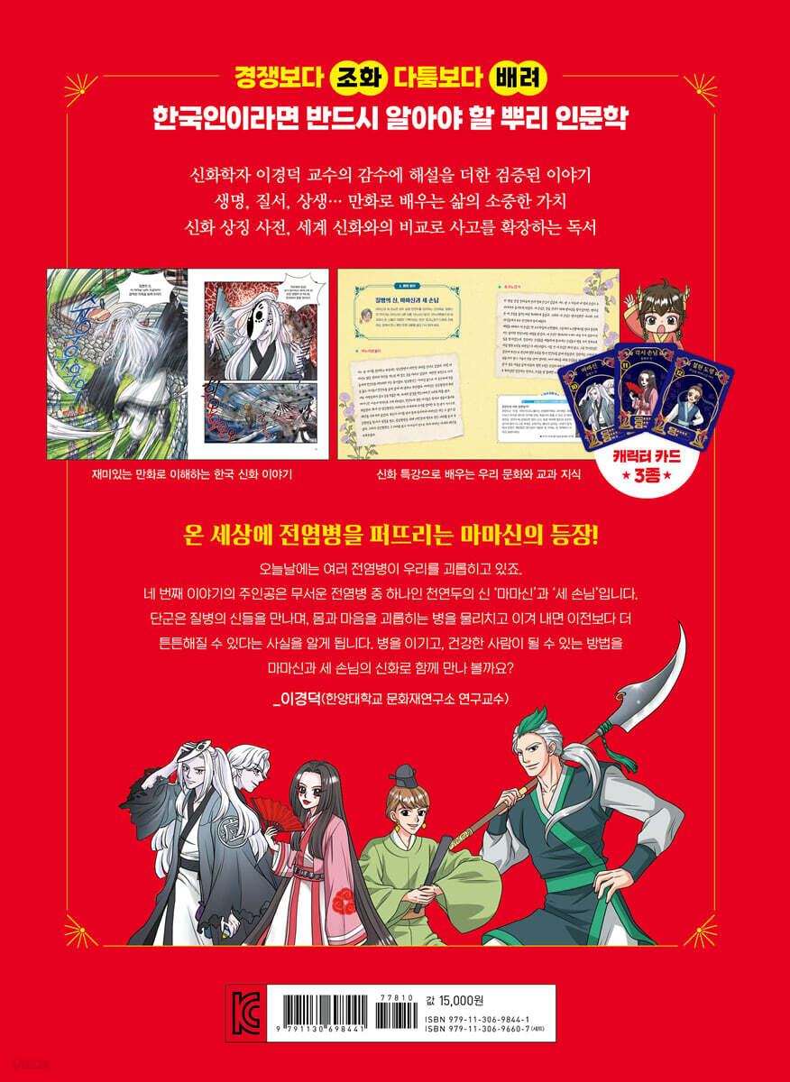 1. 나의 정체성에 대한 답을 주는 우리 문화의 뿌리 신화는 오래전부터 이 땅에서 살아온 사람들이 겪은 삶의 경험과 생각이 담긴 이야기다. 지금 세계가 주목하는 한국 문화는 그 뿌리에서 탄생했다. 한국 신화를 안다는 건 우리 문화에 깔린 교훈과 변하지 않는 삶의 가치를 안다는 것이다. 현대 사회를 주체적으로 살아갈 어린이들은 지금껏 우리 사회가 바라고 꿈꿨던 삶의 모습을 들여다보며 자신의 정체성을 찾아가고 세상을 바라보는 관점을 키워나갈 수 있다. 2. 지배하고 파괴하는 힘이 아닌 보살피고 살려내는 힘을 일깨우는 신화 한국 신화에는 서로 경쟁하거나 타인을 지배하기보다는 조화를 이루고 환대하는 정신이 담겨 있다. 수많은 여성 신들이 바로 그 예다. 그 어떤 신화보다도 많은 여성 신들이 주인공으로 등장한다. 이들은 그동안 우리가 익히 봐온 신과는 사뭇 다른 방식으로 문제를 해결하고 세상의 질서를 주도적으로 바로잡는다. 부드럽게 보듬고 서로를 보살피며 살아가는 힘을 보여 주는 신들의 모습은 어린이들이 살아갈 세상 속 우리의 모습을 일깨워 준다. 3. 더불어 사는 세상을 꿈꾸는 가장 현대적인 신화 한국 신화 속 신 중에는 인간에서 신이 된 경우가 많다. 신들은 먼 하늘에서 인간을 내려다보며 지배하려고만 하지 않고, 인간과 함께 부대끼며 살아간다. 한국 신화는 신과 인간이 더불어 살고, 자연과 인간이 더불어 사는 이야기를 통해 한국 신화의 가장 큰 특징인 조화의 가치를 전한다. 어린이들이 타인과 더불어 사는 마음을 키울 수 있는 이야기가 가득한 신화다. + 강력 추천! 《만화 한국 신화》 시리즈에 대한 학부모 후기 - 한국 신화도 알 수 있고, 바른 인성 교육도 되는 책으로 추천하고 싶다. _냥**로 - 홍익인간 이념이 간절히 필요한 시대에 살고 있는 어린이에게 필수적인 책! _이****비 - 재미에 교훈과 지혜까지 담긴 인문학 학습만화여서 엄마로서 적극 추천합니다. _로***M 4권 마마신 편 집중 포인트 1. 시리즈 첫 빌런?! 천연두를 퍼뜨리는 질병의 신 등장! 한국 신들을 만나는 단군의 모험에 악당 같은 질병의 신이 나타났다. 너무나도 잔인하고 무서웠던 탓에 옛사람들이 마마라고 높여 불렀던 마마신이 4권의 주인공이다. 마마신은 아무에게나 아무 때나 병을 내려 모두를 떨게 한다. 또 손님이라 불리는 다른 질병의 신들은 친절한 사람에게는 복을 주고, 무례한 사람에게는 벌로 병을 주기도 한다. 종잡을 수 없는 신들의 행동과 생생한 그림 묘사로 질병이 얼마나 우리를 고통스럽게 하는지 느낄 수 있다. 2. 질병의 신에 맞서는 생명의 신! 그 승자는? 무자비하게 병을 뿌리는 마마신에 맞서는 신은 생명의 신, 삼승할망이다. 삼승할망은 생명을 살리는 힘으로 마마신이 제 발로 자신을 찾아오게 만든다. 마마신은 신의 본분을 잊고 점점 더 큰 병을 뿌리려고 하지만, 삼승할망이 아이들을 지키는 한 쉽지는 않다. 병으로 고통받는 아이들을 살리기 위해 애쓰는 삼승할망을 통해 우리에게 질병이라는 시련이 찾아오더라도 극복할 수 있다는 희망을 보여 준다. 3. 신화학자 이경덕과 돌아보는 전염병의 고통과 치유의 희망 신화학자 이경덕 교수는 단군의 이번 모험을 통해 몸과 마음을 괴롭히는 질병을 물리치고 이겨 내면 이전보다 더 성장할 수 있다고 말한다. 이경덕 교수와 함께하는 신화 특강 코너를 통해 우리 조상들이 병에 대처한 방법과 코로나19와 같은 역사 속 전염병을 알아본다. 당장은 우리를 아프게 하지만 이겨 내고 나면 우리를 더 단단하게 하고, 변화의 계기가 되기도 하는 질병. 이번 마마신과의 만남을 통해 어린이들이 피할 수 없는 시련과 어려움을 대하는 자신만의 방법과 태도를 만들어 갈 수 있길 바란다. |