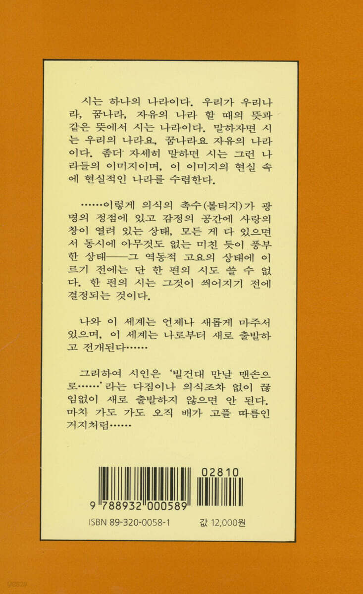 불쌍하도다 갈데없이...... 태양폭발 살이 녹는다 가을, 원수 같은 악몽과 뜬구름 고통의 축제 최근의 밤하늘 내 사랑하는 인생 꿈 속의 아모라 밤 술집 우울과 영감 새벽의 피 냉정하신 하느님께 거짓 희망을 쓰러트리는 우리들의 희망이 통사초 떨어져도 튀는 공처럼 전쟁 도덕의 원천이신 달이어 감격하세요 창 마음에 이는 작은 폭풍 태양이 떵떵거리면서 심야통화 거품과 너털웃음 천둥쳐다오 눈짓 하나가 탄생을 돕는다 네 눈은 상처이다 어디서 힘을 얻으랴 공중에 떠 있는 것들 1 : 돌 공중에 떠 있는 것들 2 : 나 공중에 떠 있는 것들 3 : 거울 공중에 떠 있는 것들 4 : 집 술잔을 들며 다시 술잔을 들며 한 고통의 꽃의 초상 사람이 풍경으로 피어나 여자의 감각을 감탄함 파랗게, 땅 전체를 이 세상의 깊음 속으로 덤벙덤벙 웃는다 납 속의 희망 악몽과 뜬구름 2 담배를 보는 일곱 가지 눈 시월의 감상 광채나느 목소리로 풀잎은 종이꽃 피도다 시간이예요 세상 초록빛을 다해 꿈으로 우는 거리 섬 - 절망할 수 없는 것조차 절망하지 말고...... (노우트 1975) - 해설 : 변증법적 상상력 - 김현 |