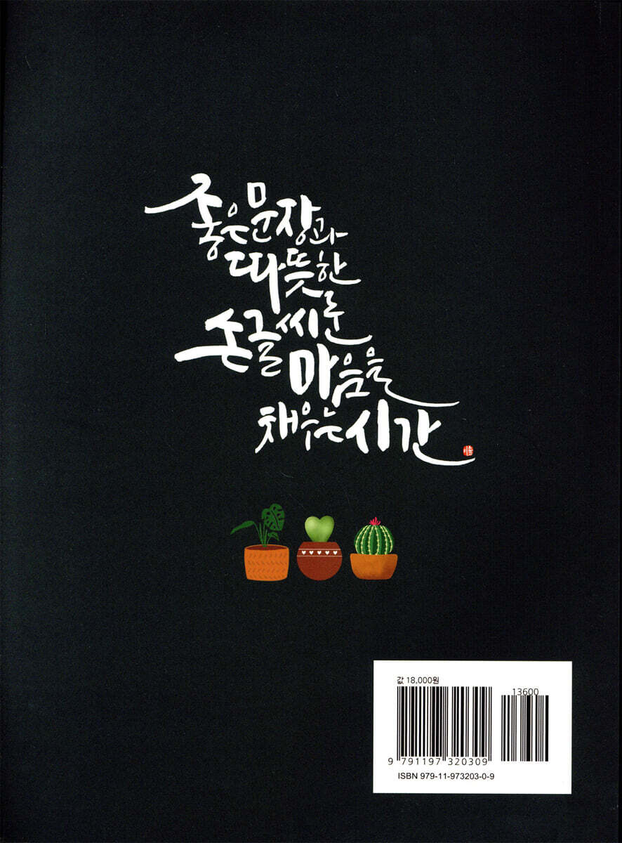 캘리그라피를 연습함에 있어서 어느 한 부분 놓치지 않으려 애쓰고, 꼼꼼하고 상세하게 설명되어 있는 부분이 돋보입니다. 독학하시는 분들이 궁금해하실 만한 부분들이 도서 내용에 잘 포함되어 있고 기초 선 연습부터 예쁜 글씨를 직접 따라 쓸 수 있도록 워크북까지 있어 캘리그라피 기초를 연습하기에 좋은 도서입니다.