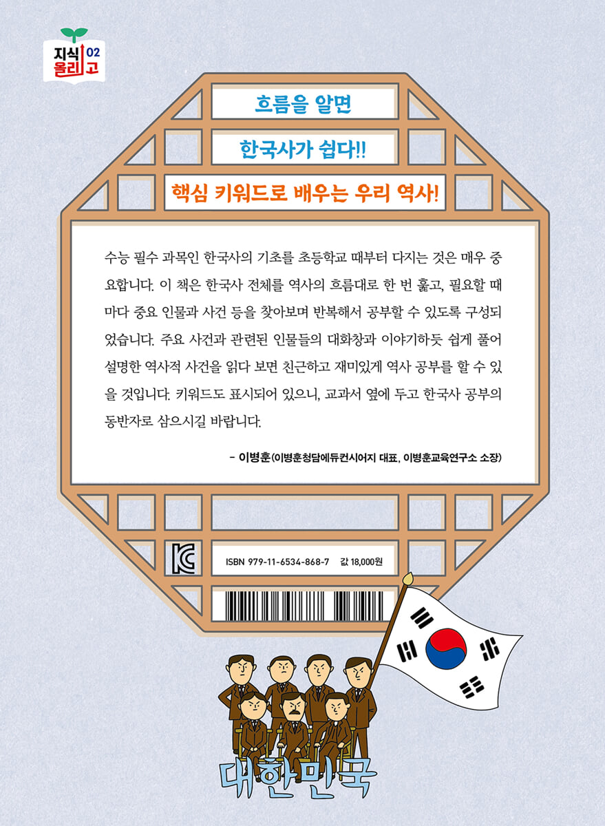 수능 필수 과목인 한국사의 기초를 초등학교 때부터 다지는 것은 매우 중요합니다. 이 책은 한국사 전체를 역사의 흐름대로 한 번 훑고, 필요할 때마다 중요 인물과 사건 등을 찾아보며 반복해서 공부할 수 있도록 구성되었습니다. 주요 사건과 관련된 인물들의 대화창과 이야기하듯 쉽게 풀어 설명한 역사적 사건을 읽다 보면 친근하고 재미있게 역사 공부를 할 수 있을 것입니다. 키워드도 표시되어 있으니, 교과서 옆에 두고 한국사 공부의 동반자로 삼으시길 바랍니다. - 이병훈 (이병훈청담에듀컨시어지 대표, 이병훈교육연구소 소장)