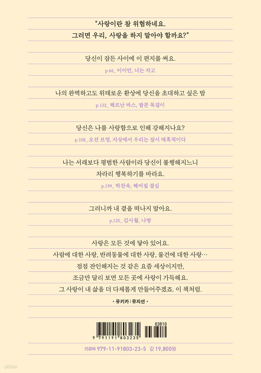 사랑은 모든 것에 닿아 있어요. 사람에 대한 사랑, 반려동물에 대한 사랑, 물건에 대한 사랑… 점점 잔인해지는 것 같은 요즘 세상이지만, 조금만 달리 보면 모든 곳에 사랑이 가득해요. 그 사랑이 내 삶을 더 다채롭게 만들어주겠죠. 이 책처럼. - Yukika (뮤지션)