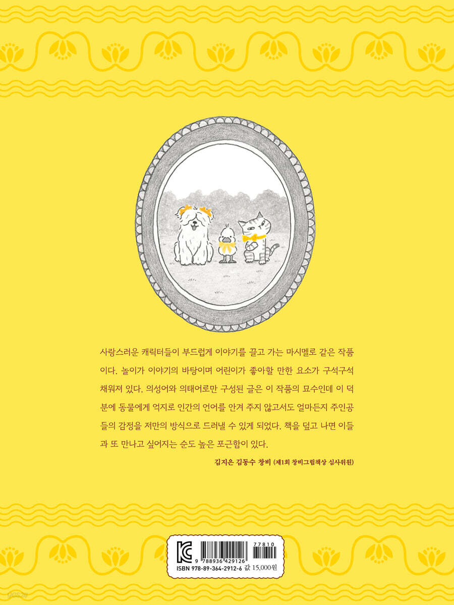 강아지,고양이,오리가 서로 마음을 열고 친구가 되어가는 이야기를 58가지의 다채로운 의성어와 의태어로 펼쳐냈다. 사랑스러운 캐릭터와 생동감 넘치는 타이포그래피가 어우러져 마치 소리가 들리는 책을 읽는 기분이 드는 그림책이다.