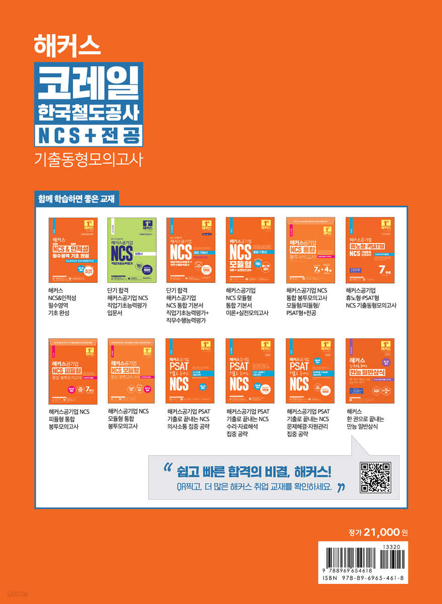 최신 기출유형을 담은 직업기초능력평가+전공 모의고사로 코레일 단번에 합격! [이런 분들에게 추천합니다] 1. 코레일 필기 최신 출제경향이 철저하게 반영된 모의고사로 실전 감각을 극대화하고 싶은 분들 2. NCS 직업기초능력평가부터 전공 모의고사까지 한번에 풀어보고 실전을 빈틈없이 대비하고 싶은 분들 3. 지원 직렬에 맞는 전공 모의고사를 풀어보고 실전 감각을 극대화하여 최종 마무리하고 싶은 분들 [해커스 교재만의 특장점] 1. 한국철도공사(코레일) 필기시험의 최신 출제경향을 철저하게 분석하여 반영하였습니다. NCS 최신 출제경향과 기출 동형 전공 문제를 확인하며 최신 출제경향을 쉽게 파악할 수 있습니다. 2. [기출복원모의고사(NCS 2회) +기출동형모의고사(NCS 5회+전공 2회)]로 시험 전 최종 마무리가 가능합니다. 1) NCS 기출복원모의고사(NCS 2회) 2023년 3월 4일 오전/오후에 시행된 한국철도공사의 최신 출제 경향을 철저히 분석하여 반영한 기출복원모의고사로 NCS 직업기초능력에 대한 실전을 확실하게 대비할 수 있습니다. 2) NCS 기출동형모의고사(NCS 5회) - 최신 시험 출제유형과 난이도를 반영한 'NCS 기출동형모의고사 4회분’을 실전과 동일한 시간 내에 풀어보면서 실전 감각을 기를 수 있습니다. - 온라인에서 추가로 제공하는 ' NCS PSAT형 온라인 모의고사 1회분'을 통해 철저한 심화 학습 및 시험 전 최종 마무리가 가능합니다. 3) 전공 기출동형모의고사(전공 2회) 전공(경영학/기계일반/전기일반/토목일반/건축일반/전기이론) 기출동형모의고사를 각 2회씩 수록하여, 이를 풀어보면서 지원 직렬의 전공 시험을 빈틈없이 대비할 수 있습니다. 3) OMR 카드 실제 시험처럼 OMR에 직접 답을 체크하며 실전 감각을 극대화할 수 있습니다. 3. [약점 보완 해설집]을 통해 취약한 부분을 극복하고 단번에 합격할 수 있습니다. 1) 취약 영역 분석표 자신의 실력을 점검함으로써 극복해야 할 취약점을 정확히 파악하고, 틀리거나 풀지 못한 문제를 다시 풀어보거나 취약한 부분을 집중 보완하여 약점을 극복할 수 있습니다. 2) 오답 체크 정답과 오답의 이유를 꼼꼼히 분석해주는 상세한 해설로 맞힌 문제와 틀린 문제 모두 확실하게 학습할 수 있습니다. 3) 빠른 문제 풀이 Tip & 더 알아보기 문제풀이 노하우를 익혀 풀이 시간을 단축할 수 있으며, 문제와 관련된 추가 개념까지 한 번에 학습할 수 있습니다. 4. [무료 바로 채점 및 성적 분석 서비스] 와 [맞춤 학습 플랜]으로 효율적인 학습이 가능합니다. 1) 무료 바로 채점 및 성적 분석 서비스 ‘약점 보완 해설집’에 수록된 QR 코드를 인식하여 정답을 입력하기만 하면 간편하게 채점할 수 있고, 응시 인원 대비 자신의 성적 위치와 학습방향을 확인할 수 있습니다. 2) 맞춤 학습 플랜 본 교재에서 제공하는 ‘3일/5일 완성 학습 플랜’ 중 자신의 학습 기간에 맞는 플랜에 따라 학습하면 혼자서도 단기간에 전략적으로 대비할 수 있습니다. [코레일 최종 합격을 위한 해커스만의 추가 학습 콘텐츠 - 해커스공기업(public.Hackers.com)] 1. 본 교재 인강(교재 내 할인쿠폰 수록) 2. 전공 이론 핵심 압축 정리 3. 무료 바로 채점 및 성적 분석 서비스 4. NCS PSAT형 온라인 모의고사(교재 내 응시권 수록) 5. 인성검사 온라인 모의고사(교재 내 할인쿠폰 수록) |