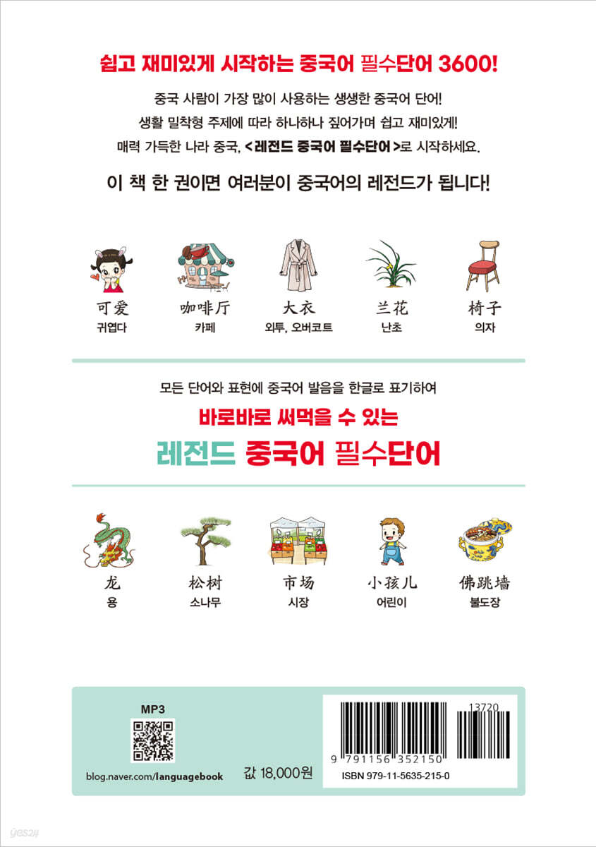 1. 중국어 필수 어휘 약 3,600개! 왕초보부터 초·중급 수준의 중국어 학습자를 위한 필수 어휘집으로, 일상생활에서 꼭 필요한 대표적인 주제 24개를 선정하였고, 추가로 11개의 주제를 포함하여 약 3,600여 개의 어휘를 담았습니다. 24개 주제별 어휘 학습 후 ‘꼭 써먹는 실전 회화’의 짧고 재미있는 상황을 통해 회화에서 실제로 어떻게 응용되는지 확인해 보세요. 그리고 6개 챕터의 마지막에는 간단한 ‘연습 문제’가 있어 테스트도 할 수 있습니다. 2. 눈에 쏙 들어오는 그림으로 기본 어휘 다지기! 1,000여 컷 이상의 일러스트와 함께 기본 어휘를 쉽게 익힐 수 있습니다. 재미있고 생생한 그림과 함께 학습하는 기본 어휘는 기억이 오래 남습니다. 3. 바로 찾아 즉시 말할 수 있는 한글 발음 표기! 기초가 부족한 초보 학습자가 중국어를 읽을 수 있는 가장 쉬운 방법은 바로 한글로 발음을 표기하는 것입니다. 중국어 발음이 우리말과 일대일로 대응하지 않지만, 여러 분의 학습에 편의를 드리고자 중국에서 사용하는 표준 발음과 최대한 가깝게 한글로 표기하였습니다. 초보자도 자신 있게 말할 수 있습니다. 4. 말하기 집중 훈련 MP3! 이 책에는 중국어 한어병음부터 기본 단어, 기타 추가 단어까지 원어민의 정확한 발음으로 녹음한 파일이 들어 있습니다. 중국어만으로 구성된 ‘중국어’ C 버전과 중국어와 한국어를 이어 들을 수 있는 ‘중국어 + 한국어’ K 버전, 두 가지 파일을 제공합니다. 학습자 수준과 원하는 구성에 따라 파일을 선택하여, 자주 듣고 큰 소리로 따라하며 학습 효과를 높여 보세요. 쉽고 재미있게 시작하는 중국어 필수 단어 중국어는 세계에서 가장 많은 인구수가 사용하는 언어로, 최근 가장 핫하게 떠오르는 외국어이기도 합니다. 중국의 세계적 지위가 급부상될 것으로 예견되는 만큼 많은 사람들이 중국어를 배우며, 중고등학교의 제2외국어로 가장 많이 선택합니다. 중국은 예로부터 우리나라와 가까운 관계를 갖고 있는 나라로, 우리가 흔히 사용하는 한자만으로도 중국어와 통하기 때문에 한국인이 가장 배우기 쉬운 외국어이기도 합니다. 물론 우리말이나 영어처럼 음으로 표기하는 표음문자가 아니라, 뜻으로 표기하는 표의문자라 어렵게 느낄 수도 있지만, 중국어의 발음을 표기하는 한어병음을 잘 익히고 사전 찾는 방법을 습득하면 더 이상 어렵지 않을 것입니다. 세계에서 가장 많은 사람들과 소통할 수 있는 언어인 중국어를 자신 있게 시작해 보세요! 이 책은 상황에 따라 적재적소에 쓸 수 있는 다양한 주제별 단어를 배우고, 예문을 살펴보며 내 실력으로 만들 수 있도록 구성되어 있습니다. 또한 유의어 등을 많이 정리하여, 격식을 차려야 하거나 편하게 이야기를 나눠야 하는 상황에 따라 어울리게 사용할 수 있도록 하였습니다. |