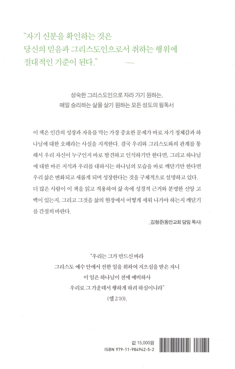 이 책은 인간의 성장과 자유를 막는 가장 중요한 문제가 바로 자기 정체감과 하나님에 대한 오해라는 사실을 지적한다. 결국 우리와 그리스도와의 관계를 통해서 우리 자신이 누구인지 바로 발견하고 인식하기만 한다면, 그리고 하나님에 대한 바른 지식과 우리를 대하시는 하나님의 모습을 바로 깨닫기만 한다면 우리 삶은 변화되고 새롭게 되며 성장한다는 것을 구체적으로 설명하고 있다. 더 많은 사람이 이 책을 읽고 적용하여 삶 속에 성경적 근거와 분명한 신앙 고백이 있는지, 그리고 그것을 삶의 현장에서 어떻게 세워 나가야 하는지 깨닫기를 간절히 바란다. - 김형준 (동안교회 담임 목사)
