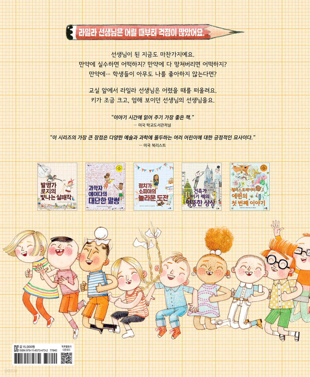 선생님은 선생님의 선생님이 해준 말을 떠올려요. 선생님은 무슨 말을 해주셨을까요? 그리고, 아이들과 잘 인사할 수 있을까요? 좋아하는 일을 마음껏 하는 아이들을 그린 시리즈 〈발명가 로지의 빛나는 실패작〉, 〈과학자 에이다의 대단한 말썽〉, 〈정치가 소피아의 놀라운 도전〉, 〈건축가 이기 펙의 엉뚱한 상상〉, 〈일러스트레이터 에런의 첫 번째 이야기〉…. 이 중 들어본 이름이나, 익숙한 제목이 있나요? 이 시리즈는 넷플릭스에서 어린이 애니메이션으로 방영 중인 ‘과학자 에이다의 대단한 말썽’의 원작 시리즈입니다. 성별과 인종 등을 가리지 않고 좋아하는 일, 하고 싶은 일에 마음껏 집중하는 다양한 아이들을 그려내 많은 사랑을 받는 시리즈지요. 이번에는 2학년 아이들 중 한 명이 아닌, 매 이야기에 등장하는 라일라 선생님이 주인공으로 등장했습니다. 라일라 선생님은 어떤 이야기를 가지고 찾아왔을까요? 시리즈의 여섯 번째 책이자, 보너스 선물 같은 책인 〈올해의 선생님, 라일라 그리어〉를 만나 보세요. 아이도 어른도 피할 수 없는 ‘불안함’ 누구나 처음과 시작은 떨리고 불안합니다. 그중 입학과 새 학기, 전학은 아이들에게 무척 떨리는 일입니다. 새로운 학교를 가 새로운 환경에 적응해야 하고, 새로운 친구들과 선생님을 만나니까요. 그런데 여기, 아이들만큼이나 교실에 들어가는 게 떨리는 사람이 있습니다. 〈올해의 선생님, 라일라 그리어〉의 주인공 라일라 선생님입니다. 사실 라일라 선생님은 어릴 때부터 무척, 다른 아이들보다 유달리 걱정이 많았습니다. ‘만약에 괴물이 나타나면 어쩌지? 만약에 벌한테 쏘이면 어쩌지?’처럼 도무지 일어나지 않을 법한 일, 아직 일어나지 않은 일을 걱정하며 불안에 떨었지요. 그런 라일라에게 갑작스러운 이사와 전학은 무척 충격적인 일이었기에, 라일라는 또다시 ‘만약에’로 시작하는 온갖 걱정을 시작합니다. 그러나 라일라는 2학년을 보내며, 그리고 차츰 성장하며 ‘만약에’로 시작하는 ‘만약에 걱정들’을 다스리는 법을 익히게 되고, 소중한 마음을 품게 됩니다. 그렇기에 선생님으로서 아이들을 처음 만나게 되는 날, 갑작스레 ‘만약에 걱정들’이 몰려왔음에도 예전의 기억을 떠올리며 교실로 들어갈 수 있었지요. 어린 라일라와 새 담임 선생님을 기다리며 떨리는 얼굴로 웃는 17명의 아이처럼, 그리고 어른이 된 라일라 선생님처럼 불안은 어린이에게도 어른에게도 모두 찾아오는 감정입니다. 살아가면서 누구나 느끼는 감정이기에, 불안은 도망치고 피해야 하는 감정이 아닌 받아들인 뒤 이를 해소하고 다독여야 하는 감정이지요. 불안을 해소하는 방법은 개개인마다 다 다릅니다. 그렇다면 라일라 선생님은 이 ‘만약에 걱정들’과 불안함을 어떻게 해소했을까요? 다정함이 바꾸는 세계 어린 라일라의 ‘만약에 걱정들’과 불안을 해소할 길을 찾아준 건, 라일라를 관심 있게 지켜보던 담임 선생님, 컨 선생님의 ‘다정함’이었습니다. 새로운 환경에 적응하지 못하던 라일라는 ‘칠판을 지워달라.’는 선생님의 부탁을 들어주며 선생님과 많은 대화를 합니다. ‘예전 이야기, 요즘 이야기, 시시콜콜한 이야기부터 중요한 이야기’까지 가리지 않고 말이지요. 이야기를 경청하는 선생님이 있어 라일라의 마음이 조금씩 풀려가던 중, 선생님은 종종 다른 아이들에게도 똑같은 부탁을 해 라일라와 함께 칠판을 지우게 합니다. 어린 라일라는 눈치채지 못했지만, 눈치 빠른 독자들은 여기서 선생님의 ‘다정함’을 느낄 수 있습니다. 라일라를 돕는 친구들은 모두 라일라와 관련된 친구들이었으니까요. 컨 선생님은 ‘다정함’으로 라일라의 세계를 넓혀주었습니다. 그리고 ‘만약에’가 언제나 무섭지만은 않다는 것을, 다른 사람들의 도움을 받아 불안과 걱정을 풀어갈 수 있다는 것을 알려주었지요. 컨 선생님이 라일라에게 남긴 다정함은 라일라 선생님을 통해 다른 아이들에게도 전해집니다. 컨 선생님이 복도까지 라일라를 찾아와 ‘만약에’가 항상 무섭기만 한 게 아닐 거라 넌지시 말해준 것처럼, 라일라 선생님도 자신이 맞닥뜨린 상황이 무서워 복도로 도망친 학생을 찾아와 진심으로 고맙다고 말해준 적이 있으니까요. 어린 라일라처럼 아이들이 바로 알아차리지는 못하더라도, 각 시리즈 곳곳에 보이는 라일라 선생님의 다정함은 아이들의 세계를 멋지게 바꿔줄 것입니다. 물론 〈올해의 선생님, 라일라 그리어〉에서는 컨 선생님의 다정함이었지만, 다정함은 선생님을 비롯한 누구나 베풀 수 있습니다. 로지의 할머니가 풀 죽은 로지를 다정하게 위로해준 것처럼, 소피아와 할아버지가 이웃을 돕고 함께 살아가는 도시를 더 좋게 바꾸려 했던 것처럼요. 누군가의 세계를, 더 나아가 함께 살아가는 세계를 바꾸는 다정함의 힘을 느낄 수 있을 거예요. 시리즈 속에서 이어지는 뜯어보는 재미가 있는 그림 ‘도전하는 아이들’ 시리즈의 그림은 구석구석 뜯어보는 재미가 있어 여러 번 볼수록 새로운 것이 눈에 들어오는 게 특징입니다. 세계 곳곳의 다양한 실제 건축물을 그려낸 〈건축가 이기 펙의 엉뚱한 