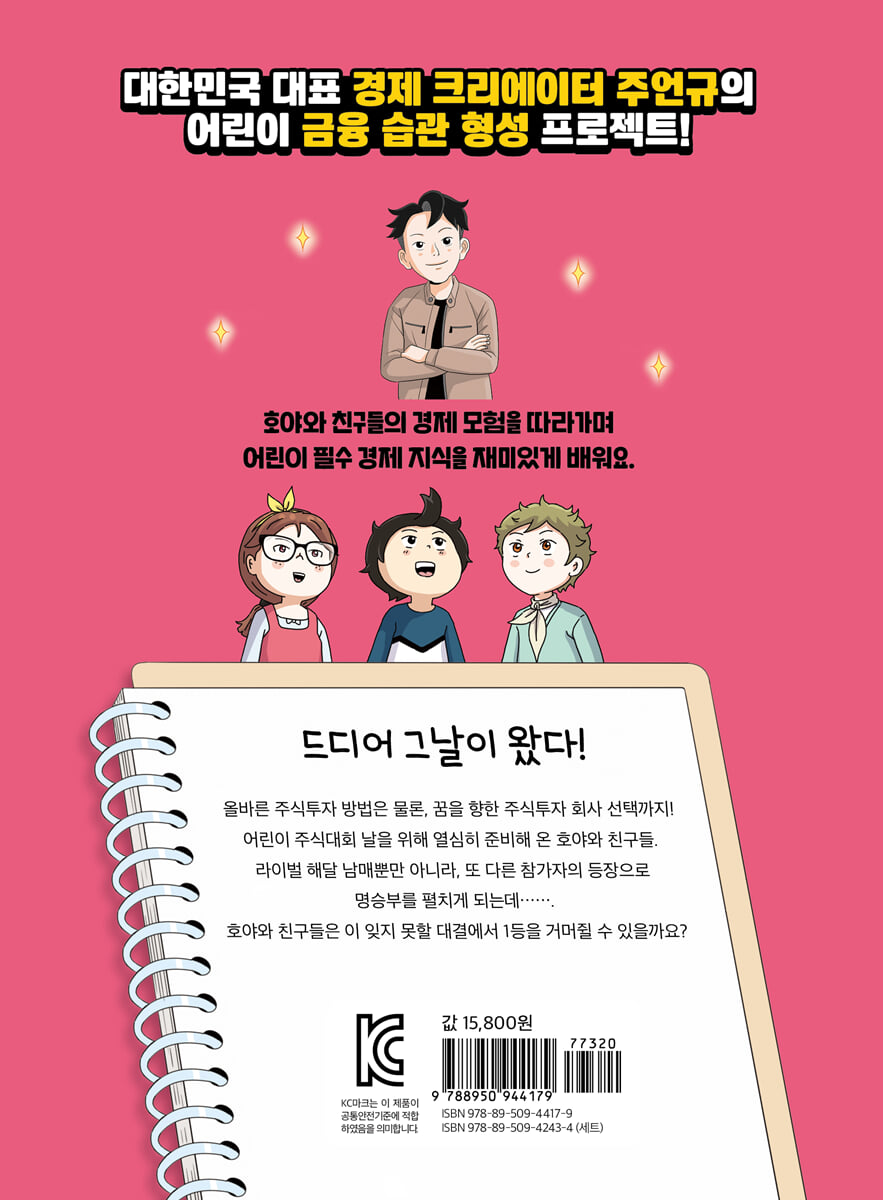 (전)신사임당 주언규와 함께하는 금융 습관 기르기 프로젝트! 이 책을 기획한 주언규는 대한민국 대표 경제 크리에이터로서 수많은 부자들을 만나며, ‘어떻게 하면 부자가 될 수 있는지’를 물어보았다고 합니다. 저마다 돈을 버는 방법은 달랐지만, 그들에게는 공통점이 하나 있었습니다. 어렸을 때부터 스스로 돈을 공부하고 관리하는 좋은 습관을 길러왔다는 것입니다. 이러한 경험들이 차곡차곡 쌓이면서 평생의 부를 좌우할 경제 습관을 형성했던 것이지요. 어린이들이 이처럼 올바른 경제 습관을 형성할 수 있도록, 주언규가 첫 경제 학습 만화를 기획했습니다. 필수 경제 개념이 담긴 에피소드들을 따라가다 보면 경제가 어렵고 지루하게만 느껴졌던 어린이도 경제 공부의 즐거움을 느낄 수 있을 거예요. 호야와 친구들의 좌충우돌 돈 모으기 대작전!부자가 되고 싶은 어린이라면 꼭 알아야 할 경제 지식을재미있는 학습 만화로 배워요. 아이돌이 꿈인 주인공 호야가 댄스 학원비를 벌기 위해 장사에 뛰어들었었죠. 지금은 돈을 벌겠다는 목적을 넘어 친구들과 경제를 공부하고 스스로 돈을 번다는 것에 의의를 두고 경제 공부를 열심히 하고 있는 호야. 그러던 중 찾아온 주식대회라는 기회! 진정한 투자는 어떻게 하는 것인지, 어떤 주식 종목을 골라야 할지. 같은 반 친구 진양, 여진, 가을, 브래드와 호야가 고른 주식은 과연 무엇일까요? 호야와 친구들을 따라 직접 부딪히고 배우며, 어린이가 꼭 알아야 할 경제 지식을 쉽고 재미있게 배워 보세요. 초등 사회 교과 연계 학습 코너로한 걸음 앞서는 경제 지식을 머릿속에 쏙! 초등 4~6학년 사회 교과와 연계된 학습 코너로 한 걸음 앞서는 경제 지식을 재미있게 학습할 수 있어요. 각 장의 마지막에 수록된 ‘아빠와 함께 경제 톡톡’ 코너에서는 호야가 궁금했던 경제 개념을 아빠 주언규가 쉽게 풀어 설명해 줘요. ‘한국거래소는 어떤 일을 하나요?’, ‘주식 대신 할 수 있는 건 없을까요?’와 같은 기본적인 물음에서부터 경제적 희소성, 대출, 주주의 권리 등 필수 경제 개념에 대한 질문과 답변을 따라 읽다 보면 어려웠던 경제가 쏙쏙 이해될 거예요. |