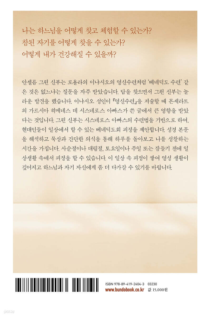 오늘날 사람들이 피정을 이야기할 때, 그것은 대개 영신수련을 뜻한다. 영신수련은 예수회 창설자인 로욜라의 이냐시오 성인이 창안하여 널리 퍼진 것을 말한다. 이냐시오 성인이 제시하는 영신수련은 30일 동안 진행되고, 오늘날에도 예수회원들은 수도 생활 동안 이 원형대로 여러 차례 수련한다. 예수회원이 아닌 사람들도 오늘날 대부분 일주일 일정으로 축소해 수련한다. 독일 베네딕도회 뮌스터슈르작 수도원의 안셀름 그륀 신부는 ‘베네딕도 수련’ 같은 것은 없느냐는 자주 질문을 받아 왔다. 여태껏 그는 ‘없다’라고 대답했지만 새로운 실마리를 찾아냈다. “최근 몇 년 동안 여러 문헌에서 다음과 같은 사실이 반복적으로 지적되었습니다. 이냐시오 성인이 영신수련에 관한 책을 저술할 때 몬세라트의 개혁 수도원장인 가르시아 히메네스 데 시스네로스(1455년~1510년) 아빠스가 쓴 글에서 영향을 크게 받았다는 것입니다”(10쪽). 영신수련의 가장 중요한 주제는 ‘어떤 인생을 살 것인가 선택’하는 것인 반면, 시스네로스 아빠스의 수련은 ‘하느님을 깊이 체험하는 것’이다. 시스네로스 아빠스의 수련서가 수도승을 대상으로 한 것이지만, 저자는 하느님을 경험하면서 성장하고자 하는 모든 이가 이 수련을 할 수 있다고 말한다. “하느님을 어떻게 찾고 체험할 수 있는가? 하느님께서 창조하신 나만의 고유한 형상인 ‘참된 자기’를 어떻게 찾을 수 있는가? 어떻게 내가 건강해질 수 있을까?”라고 묻는 이에게 저자는 베네딕도회 피정을 제안한다. 그리스도교 신비주의의 세 가지 길인 정화의 길, 조명의 길, 일치의 길을 토대로 한 이 피정에서 저자는 성경 본문을 묵상한 뒤에 묵상거리를 제시하고, 성경이 우리에게 전해 주는 내용을 구체적으로 수련할 수 있는 의식을 권한다.