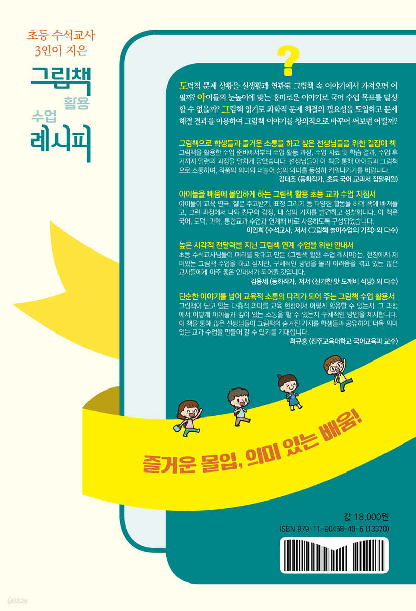 이 책은 아이들과 즐겁고 의미 있는 수업을 꿈꾸는 수석교사 세 분이 만들었습니다. 교과서와 그림책을 연계한 수업이 아이들을 배움에 몰입하게 합니다. 아이들은 핵심 질문으로 답을 찾아가는 과정에서 그림책 내용을 이해합니다. 교육 연극, 질문 주고받기, 표정 그리기 등 다양한 활동을 하며 책에 빠져듭니다. 그런 과정에서 나와 친구의 감정, 내 삶의 가치를 발견하고 성찰합니다. 이 책은 국어, 도덕, 과학, 통합교과 수업과 연계해 바로 사용하도록 구성되었습니다. 그림책으로 아이들과 어떤 수업을 할까 고민하는 선생님께 일독을 권합니다. - 이인희 (수석교사, 저서 『그림책 놀이수업의 기적』 외 다수)