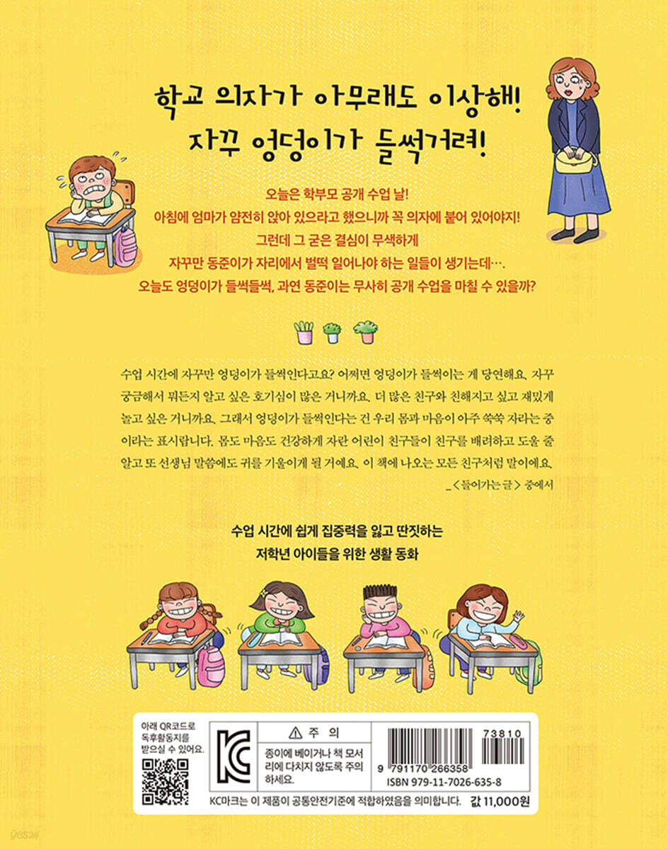 오늘도 엄마는 잔소리! 두근두근, 학부모 공개 수업 날! 자꾸 엉덩이가 들썩여요! 엉덩이야! 조금만 더 힘을 내! 가만히 있을 수 없어! 정의의 용사 출동이다! 엉덩이가 들썩들썩 상 **수업 시간에 집중할 수 있는 방법 |