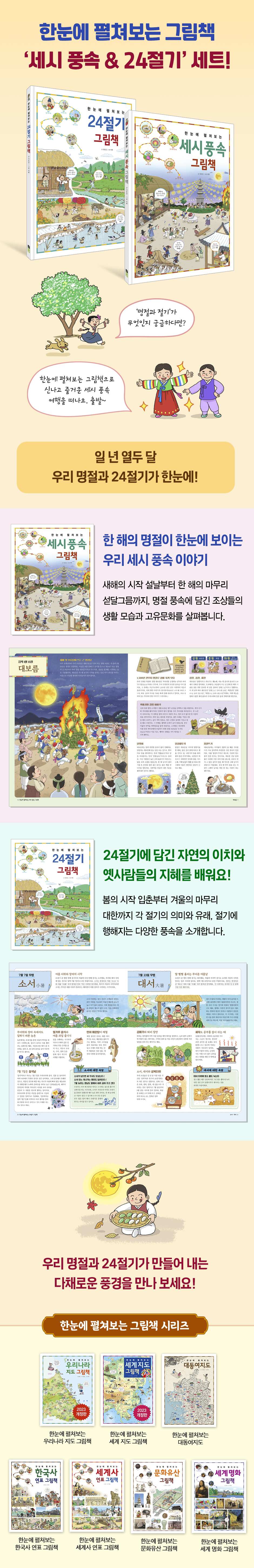24절기에 담긴 자연의 이치와 옛사람들의 지혜를 배워요! 우리 조상들은 예로부터 태양의 움직임에 따라 일 년을 세분한 24절기를 계절의 기준으로 삼고 농사와 일상생활에 이용해 왔습니다. 봄비가 내리고 새싹이 돋아나는 우수에는 씨앗을 고르며 한 해 농사 준비를 시작하고, 낮이 가장 긴 하지에는 감자를 캐고 무더위와 장마에 대비합니다. 찬 이슬이 맺히고 단풍이 짙어지는 한로에는 서둘러 가을걷이를 마치고, 밤이 가장 긴 동지에는 팥죽을 쑤어 먹으며 밝고 따뜻한 겨울을 기원합니다. 『한눈에 펼쳐보는 24절기 그림책』은 봄의 시작을 알리는 입춘부터 겨울을 마무리하는 대한까지 일 년 열두 달 한 달에 꼭 두 번씩 찾아오는 24절기를 재미있는 이야기와 그림으로 엮은 책입니다. 각 절기 이름에 담긴 뜻과 유래를 알아보고, 낮과 밤의 길이, 기후와 날씨 등 절기에 따라 나타나는 자연 현상을 살펴봅니다. 자연의 흐름에 맞춰 농사를 짓고 집안일을 돌보고 다가올 계절을 준비한 옛사람들의 지혜도 함께 배울 수 있습니다. 24절기가 만드는 다채로운 풍경 속으로! 경칩은 밸런타인데이처럼 사랑을 고백하는 날이래요! 곡우에 먹는 곡우살이는 무엇일까요? 처서가 지나면 정말로 모기 입이 비뚤어질까요? 크리스마스가 원래 동짓날이라고요? 절기에 행해지는 다양한 풍습과 먹거리, 절기에 얽힌 흥미로운 속담과 세계 여러 나라의 절기 풍속을 『한눈에 펼쳐보는 24절기 그림책』에서 만날 수 있습니다. 여기에 어린이들이 24절기를 더욱 쉽고 즐겁게 익힐 수 있도록 절기의 흐름과 특징이 한눈에 보이는 절기 표를 책에 싣고, 친근하고 익살스러운 그림으로 가득 채웠습니다. 절기는 지금까지도 여전히 우리 생활 속에 스며들어 있습니다. 일기 예보 방송에서는 때가 되면 절기에 빗대어 날씨를 전하고, 집에서는 절기에 맞춰 김장을 하거나 동지팥죽 같은 음식을 만들어 먹습니다. 이 특별한 그림책으로 24절기가 만들어 내는 다채로운 풍경을 만나 보세요. 일 년 열두 달 계절이 변화하는 자연의 이치를 깨닫고, 오랜 시간 이어져 온 뜻깊은 풍습과 조상들의 지혜를 자연스럽게 익힐 수 있을 거예요! 이 책의 특징 1. 절기 이름에 담긴 뜻과 유래를 알아봐요! 한자어로 된 절기 이름 하나하나에 뜻을 풀고 해석을 덧붙여, 각각의 절기가 어떻게 유래되었는지 쉽게 알 수 있습니다. 절기의 특징이 한눈에 보이는 절기 표도 실어 24절기의 이해를 돕습니다. 2. 24절기로 일 년 열두 달 자연의 변화를 읽어요! 낮과 밤의 길이, 더위와 추위, 비와 바람, 눈과 서리 등 절기에 따라 나타나는 자연 현상을 살펴보고 이를 농사와 일상생활에 이용해 온 우리 조상들의 지혜를 배워 봅니다. 3. 절기에 얽힌 흥미로운 이야기가 가득해요! 절기에 행해지는 뜻깊은 풍습과 먹거리, 절기에 얽힌 재미있는 속담과 세계 여러 나라의 절기 풍속을 살펴보면서 24절기에 대한 지식을 넓혀 갑니다. 4. 재미있는 그림으로 24절기가 술술 읽혀요! 그림 작가의 정성이 담긴 친근하고 익살스러운 그림으로 큰 판형의 책을 가득 채웠습니다. 어린이들이 한눈에 펼쳐 보며 24절기를 더욱 쉽고 즐겁게 익힐 수 있습니다. 『한눈에 펼쳐보는 세시 풍속 그림책』 세시 풍속에 담긴 우리 조상들의 생활 모습과 문화를 배워요! 세시 풍속은 한 해의 계절이나 달, 절기에 따라 반복되어 전하여 온 풍속을 말합니다. 세시는 크게 정월(음력 1월)부터 섣달(음력 12월)까지의 명절과 24절기로 나뉘고, 그날에 행해지는 여러 가지 재미있고 뜻깊은 풍속이 전해지지요. 한 해의 시작을 알리는 설날에는 세배도 하고 떡국도 먹으며 새해를 맞이하고, 연등이 주렁주렁 열리는 사월 초파일에는 각양각색의 등불을 구경하며 축제를 즐깁니다. 오곡이 무르익는 달 밝은 추석날에는 함께 모여 햇곡으로 송편을 빚어 먹고, 한 해의 마지막 날인 섣달그믐에는 뜬눈으로 밤새우며 묵은해를 되돌아보고 새해를 준비합니다. 《한눈에 펼쳐보는 세시 풍속 그림책》은 일 년 열두 달, 달마다 찾아오는 크고 작은 우리 명절을 재미있는 이야기와 그림으로 엮은 책입니다. 각 명절의 의미와 유래를 알아보고, 그날에 행하는 풍속에 담긴 우리 조상들의 생활 모습과 고유문화를 살펴봅니다. 자연과 더불어 이웃과 어울리며 함께 일하고 때로는 신나게 즐기며 살아간 옛사람들의 지혜를 배울 수 있습니다. 열두 달 우리 명절이 만드는 다채로운 풍경 속으로! 대보름 밤에 다리를 밟고 놀면 일 년 동안 다리가 아프지 않대요! 한식날에는 왜 차가운 밥을 먹을까요? 까치 까치 설날은 정말로 새 ‘까치’의 설날일까요? 한 해의 마지막 날에 온 국민이 대청소를 하는 나라가 있다고요? 명절날 벌이는 다양한 민속놀이와 먹거리, 명절에 얽힌 흥미로운 읽을거리와 여러 나라의 명절 풍속을 《한눈에 펼쳐보는 세시 풍속 그림책》에서 만날 수 있습니다. 여기에 어린이들이 세시 풍속을 더욱 쉽고 즐겁게 익힐 수 있도록 명절의 특징이 한눈에 보이는 세시 명절 표를 책에 싣고, 친근하고 익살스러운 그림으로 가득 채웠습니다. 지금까지도 많은 세시 풍속이 전해져 우리 생활 속에 녹아들어 있습니다. 