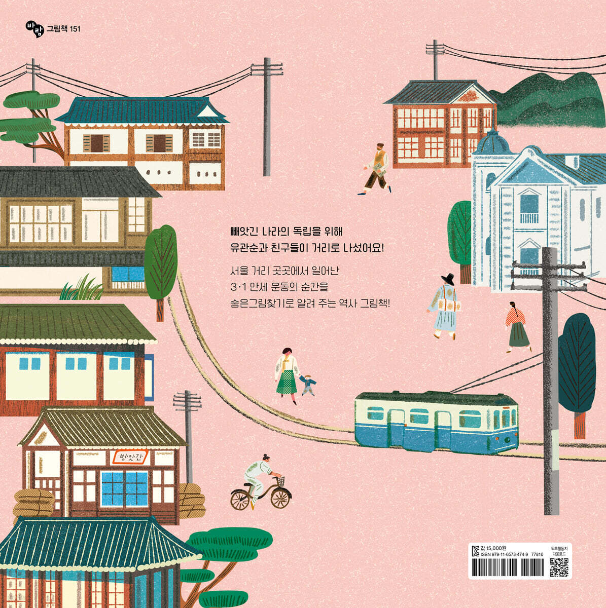 1919년 3월 1일. 사람들이 종로 거리로 나와 독립을 외치며 태극기를 흔들었습니다. 이때 유관순도 친구들과 함께 거리로 나섰습니다. 어린 학생 신분으로 왜 이렇게 위험한 행동을 했던 걸까요? 김진 작가는 유관순이 만약 이 물음을 받았다면 어떤 답을 했을까 하는 고민으로, 그림책 안에 담아 놓았습니다. “선생님, 전 옳은 일을 하라고 배웠어요. 비겁하지 말라고 배웠어요. 용기를 가지라고 배웠어요. 제가 지금 뭐라고 말해야 할까요?” 실제로 유관순은 일본 경찰에 붙잡혔을 때 무서워하는 기색 없이, 그림책 속 당당한 모습 그대로 용감했다고 전해집니다. - 나는 대한 사람이다. 나라를 위해 독립 만세를 부른 것도 죄가 되느냐. - 너희는 나에게 죄를 줄 권리가 없고, 나는 너희 왜놈들에게 재판을 받아야 할 이유가 없다. - 살아서도 독립 만세, 죽어서도 독립 만세다. 오늘날 우리는 거리로 뛰쳐나온 유관순 및 사람들 덕분에 평화롭고 안전한 세상에서 살아가는 것이지요. 〈유관순을 찾아라〉는 어린 독자들에게 매 장면 숨어 있는 유관순을 찾는 재미와 함께, 독립의 의미 및 만세 운동을 일으킨 사람들의 용기와 고마움을 느끼게 합니다. ● 다양한 모양의 태극기 〈유관순을 찾아라〉에는 조금 낯선 태극기가 등장합니다. 1910년 3·1 운동이 벌어질 때에는, 태극기 제작 방법이 정해지지 않았기 때문이지요. 그래서 당시에는 사람마다 태극기를 그린 모양이 조금씩 달랐습니다. 다나 그림작가는 〈유관순을 찾아라〉에 어떤 태극기 모양을 그릴까를 고민하다가, 만세 운동 당시 태극기를 대량으로 만드는데 사용했다고 알려진 목판을 참고 삼아 태극기를 그렸습니다. 또, 다른 형태의 태극기도 곳곳에 표현했지요. 〈유관순을 찾아라〉를 통해 어린 독자는 태극기의 변천사 및 오늘날 정해진 태극기의 모양을 보다 정확하게 알게 될 것입니다. 그리고 태극기의 모양보다 중요한 건, 나라를 사랑하는 사람들의 한마음이라는 것을 깨달을 수 있습니다. ● 아는 만큼 보이는, 공부가 즐거워지는 역사 그림책 시리즈 〈유관순을 찾아라〉에는 1910년대 세워져 있던 여러 건물 및 풍경이 등장합니다. 지금은 사라지고 없는 서대문역부터 오늘날 2층으로 지어져 있지만 당시에는 단층이었던 보신각 등이 눈길을 끌지요. 또, 이런 건물들과 함께 거리 곳곳에는 전봇대가 솟아 있고, 선로 위를 전차가 지나갑니다. 많은 건물과 풍경을 통해 어린 독자는 당시 사람들의 생활상을 짐작해 볼 수 있지요. 〈유관순을 찾아라〉는 단순히 그림책을 보는 것에서 벗어나, 호기심을 확장할 수 있도록 이끌어 줍니다. 알고 보면 오늘날에 남아 있는 건물과 변화된 환경을 이해할 수 있는 구성으로, 공부의 중요성 및 즐거움을 느끼게 해 줍니다. |