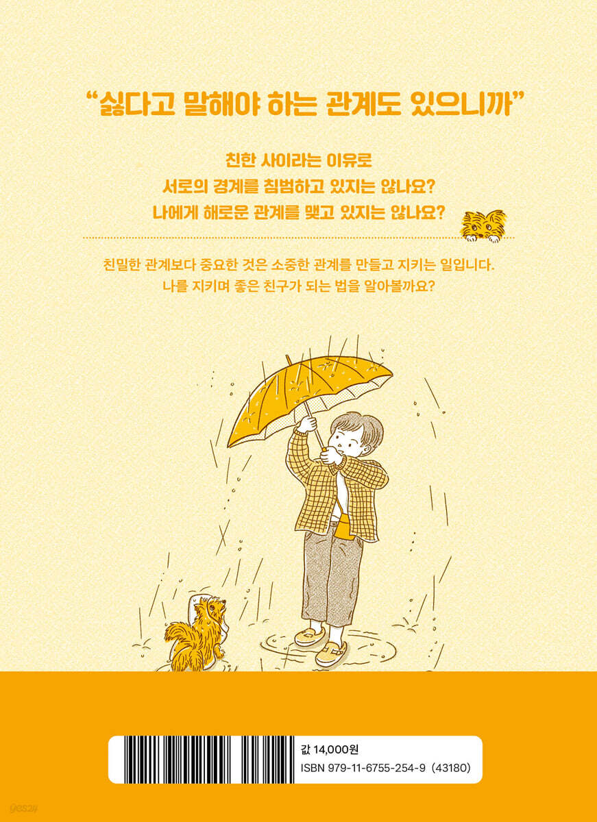 Part 1: 서로의 경계를 존중하는 관계 가꾸기 Part 2: 해로운 관계를 거절하세요 Part 3: 나는 왜 타인에게 휘둘릴까? part 4: 우리가 정말 친해질 수 있을까? part 5: 나를 지키며 좋은 친구가 되는 법 나가며: 나를 지키는 관계 돌봄을 선언합니다 |
