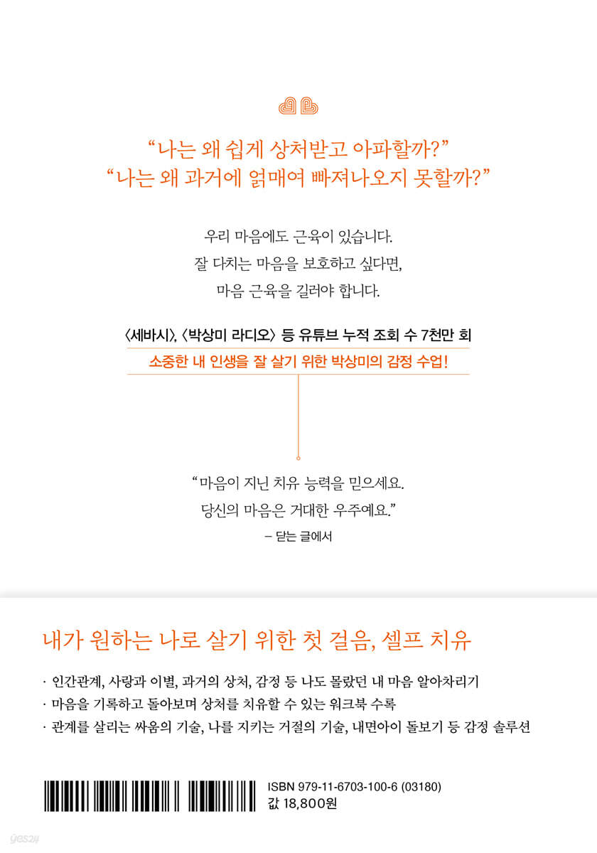 (…) 우리 마음에도 근육이 있습니다. 마음의 힘살을 기르지 않으면 어떻게 될까요? 마음의 힘을 발휘할 수도 없고, 불안과 우울에 시달리며 마음의 노화가 빨라집니다. 마음이 늙는다는 건 의욕이 꺾인다는 뜻이에요. 그러면 포기하는 데 익숙해집니다. 잘 다치는 내 마음을 보호하기 위해서 사람을 피하게 되고, 혼자만의 방으로 점점 더 숨게 됩니다. 그 방에서 ‘우울’이라는 이불을 덮고 깊은 잠에 빠지는 거죠. 그러면서 스스로 안심시키려 애씁니다. 잘 다치는 마음을 보호하고 싶다면, 마음 근육을 길러야 합니다. 마음 힘살에서 긍정 에너지를 발산해야 하며 내 인생의 기초 대사량을 증가시켜야 해요. 마음이 지쳐 있을 때는 만사가 귀찮아지고, 모든 게 두렵고 피하고만 싶어집니다. 몸을 건강검진 받듯이 마음도 정기적으로 검진을 받아 건강을 유지해야 합니다. 평소에 스스로 마음 근육을 기르는 연습을 해야 합니다. 내 마음의 근육량은 얼마나 될까요? ‘마음 힘살’을 길러야 긍정 에너지를 발산할 수 있고, 관계를 살리는 기초 대사량도 증가시킬 수 있다는 걸 기억하세요.