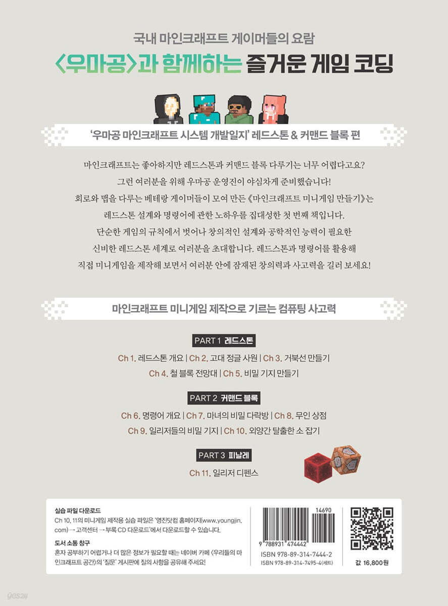 〈우리들의 마인크래프트 공간〉과 함께하는 즐거운 게임 코딩 국내 최대 마인크래프트 커뮤니티 〈우리들의 마인크래프트 공간〉 운영진이 집필한 '우마공 마인크래프트 시스템 개발일지'는 마인크래프트 유저들을 위한 컴퓨팅 사고 학습 시리즈 도서입니다. 이 시리즈에서는 전자 회로, 명령어, 프로그래밍을 다루며 게임 시스템 개발의 기초를 다집니다. 그 첫 번째 도서인 《마인크래프트 미니게임 만들기》에서는 레드스톤과 커맨드 블록을 활용하여 게임 코딩의 기초 개념을 학습합니다. 단순 따라 하기식이 아니라 장치의 작동 원리와 구조를 익히면서 미니게임을 만들어 볼 수 있습니다. 오랜 시간 마인크래프트를 플레이하며 회로와 맵을 다뤄 온 베테랑 게이머들의 레드스톤 설계, 명령어 활용 노하우를 한눈에 살펴보세요. 누구나 쉽게 즐길 수 있는 마인크래프트를 통해 게임 코딩의 기초 개념을 살펴보고 미니게임 제작자가 되어 볼 시간입니다! 〈이 책의 구성〉 [PART 1] 레드스톤 현실에서 다양한 전자 회로와 기계 장치를 이용하듯이, 마인크래프트에서는 레드스톤 장치를 만들어 많은 일을 자동화할 수 있습니다. 파트1에서는 다양한 레드스톤 장치의 원리를 공부합니다. 레드스톤 설계를 배우고 회로를 직접 만들어 보며 게임 코딩을 위한 기초 개념을 익혀 보세요. [PART 2] 커맨드 블록 컴퓨터가 이해하는 글, 즉 명령어(Command)를 이용하면 마인크래프트 세계에서 유연하고 강력한 기능들을 다룰 수 있습니다. 파트2에서는 명령어를 이용한 창작 방법을 공부합니다. 커맨드 블록을 활용해 파트 1에서 배웠던 개념들을 실제 게임 코딩에 적용해 보세요. [PART 3] 피날레 앞에서 레드스톤 설계와 명령어를 익혀 간단한 시스템들을 만들어 봤다면 이제는 앞에서 배운 지식들을 바탕으로 우리만의 게임을 창작할 시간입니다! 재미있는 미니게임을 만들기 위해 어떤 점을 고려해야 하는지, 복잡한 시스템을 어떻게 여러 부분으로 나누어서 구현하는지 등을 생각하면서 따라와 주세요. 〈도움이 필요할 때는 이렇게 해 보세요!〉 · Ch 10, 11에서 미니게임을 만들 때 명령어가 너무 많아서 입력하기 힘들다면? ‘영진닷컴 홈페이지(www.youngjin.com) → 고객센터 → 부록 CD 다운로드’에서 실습 파일을 다운받아 사용하세요. · 혼자 공부하기 어렵거나 더 많은 정보가 필요할 때에는? 네이버 카페 〈우리들의 마인크래프트 공간〉의 ‘질문’ 게시판에 질의 사항을 공유하며 다른 사람들과 함께 공부해 보세요! 저자의 말 마인크래프트라는 게임에는 배움이 있습니다. 흔히 생각하는 것처럼 아동기에나 적합한 말랑말랑한 배움이 아니고, 파고들수록 실제 공학적 원리들과 정보 기술에 접근하게 되는 진짜 공부입니다. 플레이어들은 마인크래프트를 하기 위해 모여서 서로 연결되고 하나하나 재능을 발현하고 있습니다. 사실, 게임이 놀이와 성장 동력으로 역할하는 데 있어 ‘마인크래프트’라는 게임은 일부분에 불과합니다. 세상에는 저희가 사랑하는 이 게임 말고도 좋은 것들이 많이 있으니까요. 저희가 정말 멋지다고 생각하는 것은 이런 게임들을 통해 어린 학생들이 만들어 내는 공동체 전체입니다. 학교나 학원 같은 공간에서 주어지는 인간관계가 아닌, 한국에서 같은 시기에 같은 ‘놀이’를 좋아했기에 필연적으로 이어지는 공동체들 말입니다. 그 안에서 자신들만의 문화를 창조하고, 원래라면 절대 경험하지 못했을 일들을 경험하며, 때때로 돋보이기를 원해 경쟁하고, 서로와의 화학 반응을 통해 변화하는 모습을 지금보다 훨씬 더 많은 곳에서 볼 수 있으면 좋겠습니다. 모쪼록 이 글을 읽는 부모님께서는 자녀의 취미가 오랫동안 큰 성장 자산으로 쓰일 수 있음을 이해하고, 나아가 그 관심의 영역이 더욱 넓고 깊게 발전할 수 있도록 지원을 아끼지 말아 주시기를 부탁드립니다. 그것이 자녀의 재능을 찾는 가장 쉬운 길이라고 믿습니다. 저희 마인크래프트 커뮤니티에서도 플레이어들의 성장을 위해 늘 노력하겠습니다. |