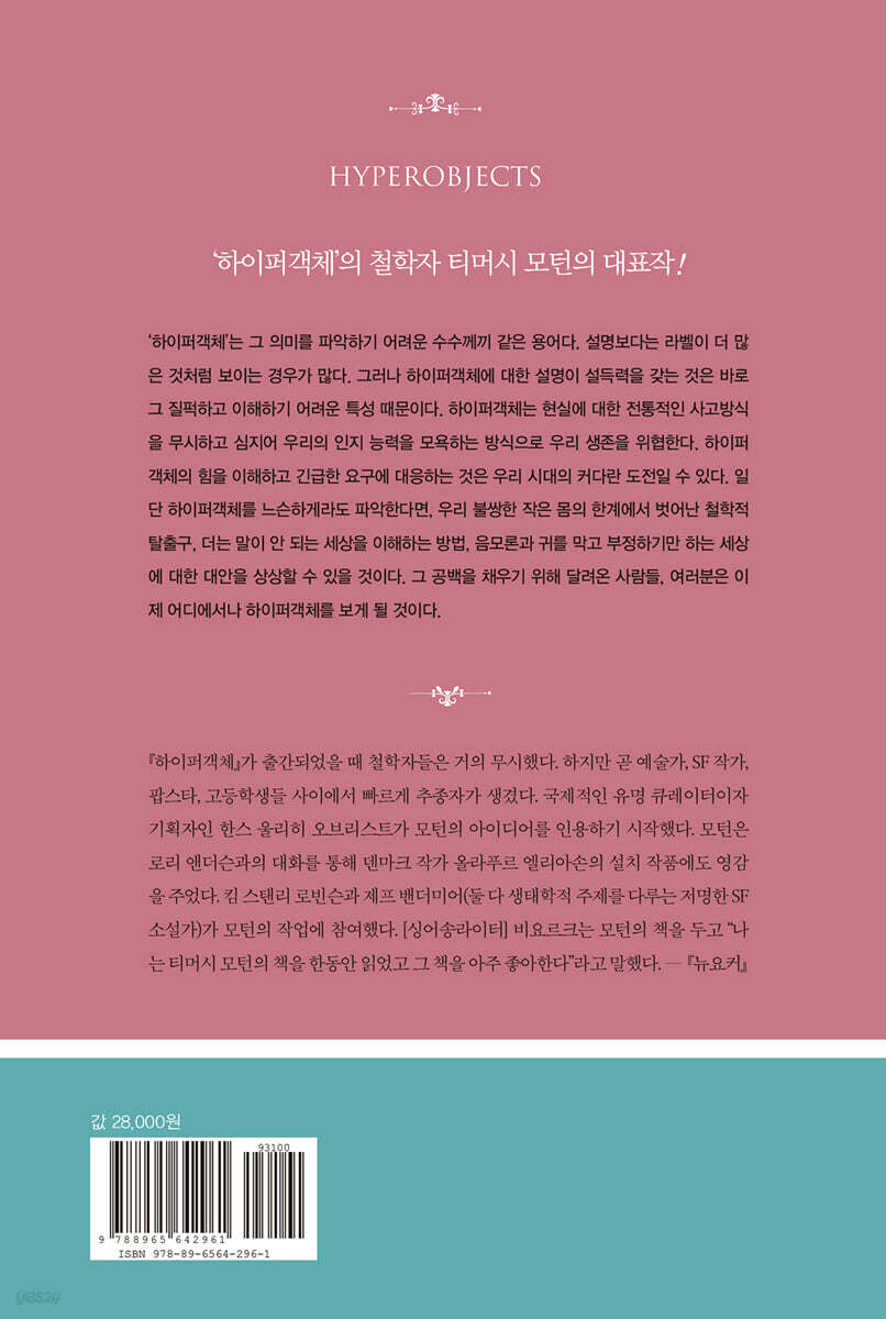 “『하이퍼객체』에서 티머시 모턴은 다양한 주제에 대한 깊은 지식을 활용해 현재의 우리 상황을 바라보는 새로운 방식을 제안한다. … 그 결과 흥미롭고도 유용한 인지적 지도그리기를 해내는 멋진 작업이 탄생했다.” - 킴 스탠리 로빈슨 (SF 소설 작가)