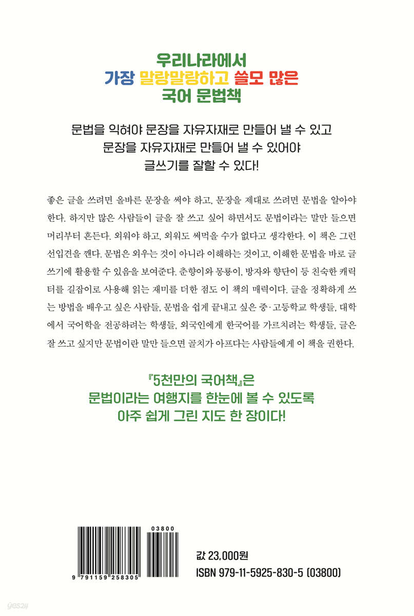 대부분의 사람들은 서로의 의사를 말과 글로 주고받는다. 그런데 아는 단어만 늘어놓는다면 어느 정도의 의사소통은 할 수 있지만 서로의 생각을 속 시원하게 주고받을 수는 없다. 다시 말해 말과 글로 생각을 전달할 때 우리는 단어가 아니라 문장을 쓰고 있다. 그런데 문장은 말의 법칙에 따라 단어들을 배열해 만든 것이다. 그러므로 단어와 말의 법칙을 안다면 자신의 생각을 올바르게 전달할 수 있다. 그러면 어떻게 해야 문장을 잘 쓸 수 있을까? 먼저 내 생각을 어떤 문장에 담아야 하는지를 알아야 하고, 그 문장을 구성하고 있는 단어들이 어떻게 배열되어야 하는지를 알아야 한다. 또 어떻게 단어를 만들고, 어떻게 표기해야 하는지도 알아야 한다. 이런 문장의 법칙을 ‘문법’이라고 한다. 법칙이란 외우는 게 아니고 이해하는 것이다. 하나를 알면 열을 알 수 있는 게 법칙이기 때문이다. 게다가 우리말 문장은 겨우 일곱 개다. 이 일곱 개 문장만 제대로 쓰면 한 편의 글을 완성하는 것은 식은 죽 먹기다. 글은 문장으로 이루어지므로 문장을 잘 쓸 수만 있다면 글도 수월하게 쓸 수 있다는 말이다. 우리나라에서 가장 말랑말랑한 우리말 문법책 이 책은 바로 이런 문장의 법칙을 알기 쉽게 풀어쓴 우리말 문법책이다. 스테디셀러인 ≪글쓰기의 전략≫의 공동 저자인 이재성 교수(서울여자대학교 국어학과)가 아주 쉽고 재미있게 우리말 문법을 알려준다. 앞의 책이 문장을 어떻게 배열해 글을 구성할 것인지에 대한 논리적 구조 방법을 제시하고 있다면, 이 책 ≪5천만의 국어책≫은 생각을 담는 가장 작은 그릇인 문장을 어떻게 제대로 쓸 수 있는지에 대한 방법을 제시한다. 이 책은 글쓰기를 위한 문법책이기 때문에, 문장에 관한 규칙(통사론)을 가장 밀도 있고 비중 있게 다루었다. 글을 잘 쓰고 싶지만 문법에 거부감이 있다면 여기까지만 읽어보아도 된다. 그러나 좀 더 정확한 글쓰기를 원한다면 단어와 소리에 관한 규칙(형태론과 음운론)도 읽어보길 바란다. 본문 중간중간에 실은 글쓰기 팁은 문법이 어떻게 글쓰기에 적용되는지 알려주고 있다. 글을 잘 쓰려면 흔히들 많이 읽고(多讀), 많이 쓰고(多作), 많이 생각하라(多商量)고 한다. 그러나 무엇보다도 글을 이루는 문장 하나하나를 제대로 쓰는 것이 글을 잘 쓰는 가장 밑바탕이다. 문장을 제대로 쓸 수 있도록 알려주는 이 책은 우리나라에서 가장 말랑말랑한 우리말 문법책이다. |