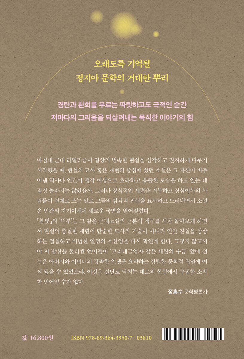 「봄빛」의 ‘뚜부’는 그 같은 근대소설의 근본적 책무를 새삼 돌아보게 하면서 현실의 충실한 재현이 단순한 모사의 기술이 아니라 인간 진실을 상상하는 절실하고 비범한 열정의 소산임을 다시 확인케 한다. 그렇지 않고서야 저 밥상을 둘러싼 언어들이 ‘고리대금업자 같은 세월의 수금’ 앞에 선 늙은 아버지와 어머니의 강퍅한 일생을 요약하는 강렬한 문학적 위엄에 어찌 닿을 수 있었으랴. 이것은 결단코 닥치는 대로의 현실에서 수집한 소박한 언어일 수가 없다. - 정홍수 (문학평론가) |