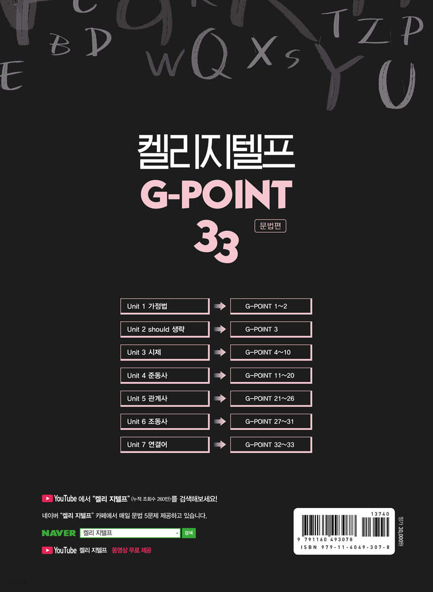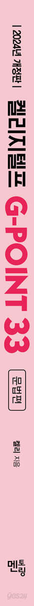 Unit 1 가정법 〉 G-POINT 1~2 Unit 2 should 생략 〉 G-POINT 3 Unit 3 시제 〉 G-POINT 4~10 Unit 4 준동사 〉 G-POINT 11~20 Unit 5 관계사 〉 G-POINT 21~26 Unit 6 조동사 〉 G-POINT 27~31 Unit 7 연결어 〉 G-POINT 32~33 각 Unit별로 순서대로 학습하여야 합니다. 출제되는 문항수와 난이도를 고려하여 가장 효율적인 학습이 가능한 순서대로 Unit을 구성하였습니다. 또한 각 G-POINT별로 다음과 구성되어 있으며 Unit이 끝날 때마다 실전문제를 실었습니다. STEP 1 〉 어법 선택 STEP 2 〉 틀린 어법 고르기 STEP 3 〉 빈칸 넣기 STEP 4 〉 실전 문제 영어 노베이스인 수험생은 STEP1부터 STEP3까지 꼼꼼하게 공부하고 실전문제인 STEP4로 넘어가야 합니다. 만약 영어 실력이 있거나 시간이 없는 수험생들은 STEP3부터 공부해도 무방합니다. 32점이 목표인 수험생들은 이 책만으로 충분하며 고득점을 취득해야 하는 수험생들은 이 책으로 문법을 빠르게 정리한 후 독해와 청취에 매진하시기 바랍니다. 2020년 1월 G-POINT 33을 출판한 이후 유튜브에 강의를 올렸고 유료강의보다 훨씬 효율적이고 압도적인 내용의 강의로 수험생들의 사랑을 받아오고 있습니다. 하지만 시험의 경향성은 늘 바뀌기 마련이므로 꾸준히 지텔프 시험에 응시해 변화된 내용을 반영해오고 있습니다. 개정된 이번 책의 특징은 다음과 같습니다. 첫째, 2023년까지 변화된 지텔프 시험의 모든 경향성을 반영하였습니다. 둘째, 2023년까지 지텔프 시험에 출제된 암기해야 할 모든 단어를 실었습니다. 셋째, 네이버 카페에서 많은 수험생들에게 받았는 질문을 토대로 오답 POINT를 더욱 자세히 실었습니다. 국내 최대 지텔프 커뮤니티 ‘켈리 지텔프 카페 (https://cafe.naver.com/kellygtelp)’ 에서는 매일 지텔프 문법 5문제를 무료로 올려드리고 있으며 다양한 자료를 무료로 받아보실 수 있습니다. 유튜브 영상을 교재와 함께 활용하시면 큰 도움이 될 것입니다. 책을 쓸 수 있는 능력을 주신 하나님과 항상 많은 도움을 주시는 정대열 사장님, 항상 힘이 되어 주시는 김보건 선생님께 머리 숙여 감사드립니다. 2024년 2월 켈리 영어 연구소에서 켈리 드림 |