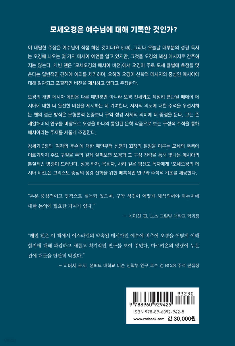 복음주의자 등 여러 기독교인은 종종 구약 성경에 대한 ‘그리스도 중심적’ 접근법을 옹호하지만, 이것이 실제로 무엇을 의미하는지에 대해 합의는 이루어지지 않았다. 케빈 첸은 고(故) 존 세일해머의 획기적인 연구를 바탕으로 오경의 메시아적 (그리스도 중심) 정체성을 신약 성경 저자나 후대 기독교 신학자의 (재)해석이 아닌 모세와 모세 이후 (영감 받은) 편집자의 저작 의도에 근거하는 오경의 비전을 제시한다. 그 결과 오경의 메시아 비전은 본문 중심적이고 영적으로 설득력 있으며, 구약 성경이 어떻게 해석되어야 하는지에 대한 논의에 필요한 기여를 하게 된다. 다른 접근법을 택하는 학자도 첸이 이렇게 유용한 책에서 제기하는 방법론적 질문에 열린 마음으로 깊이 관여함으로써 많은 도움을 받을 수 있을 것이다. - 네이선 핀 (노스 그린빌 대학교 학과장)
