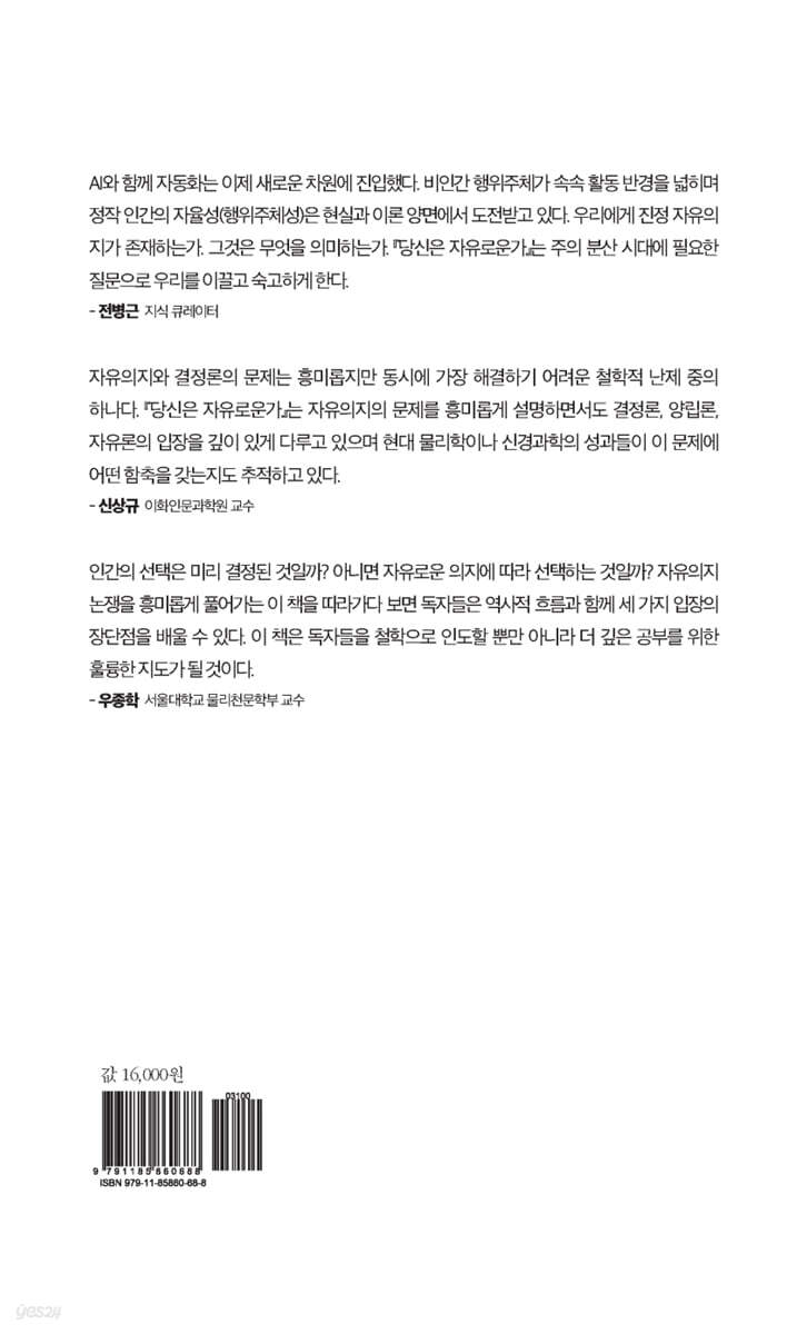 AI와 함께 자동화는 이제 새로운 차원에 진입했다. 비인간 행위주체가 속속 활동 반경을 넓히며 정작 인간의 자율성(행위주체성)은 현실과 이론 양면에서 도전받고 있다. 우리에게 진정 자유의지가 존재하는가. 그것은 무엇을 의미하는가. 『당신은 자유로운가』는 주의 분산 시대에 필요한 질문으로 우리를 이끌고 숙고하게 한다. - 전병근 (지식 큐레이터)