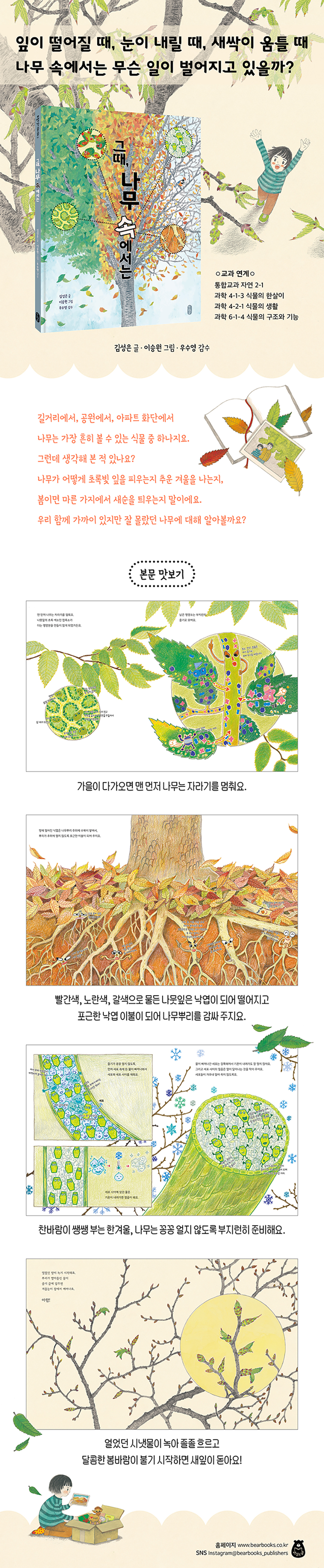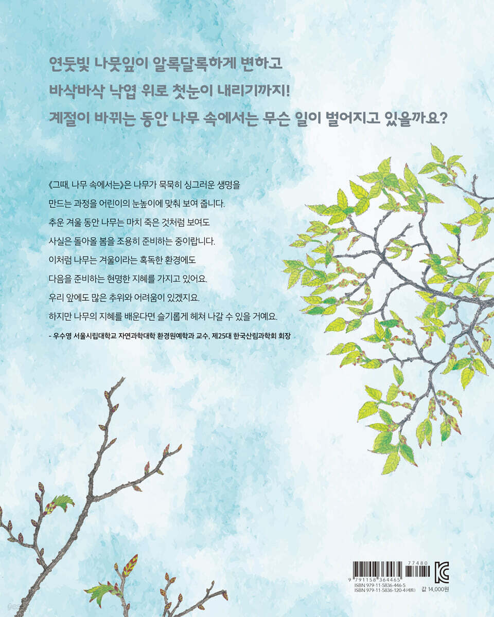 《그때, 나무 속에서는》은 나무가 묵묵히 싱그러운 생명을 만드는 과정을 어린이의 눈높이에 맞춰 보여 줍니다. 추운 겨울 동안 나무는 마치 죽은 것처럼 보여도 사실은 돌아올 봄을 조용히 준비하는 중이랍니다. 이처럼 나무는 겨울이라는 혹독한 환경에도 다음을 준비하는 현명한 지혜를 가지고 있어요. 우리 앞에도 많은 추위와 어려움이 있겠지요. 하지만 나무의 지혜를 배운다면 슬기롭게 헤쳐 나갈 수 있을 거예요.