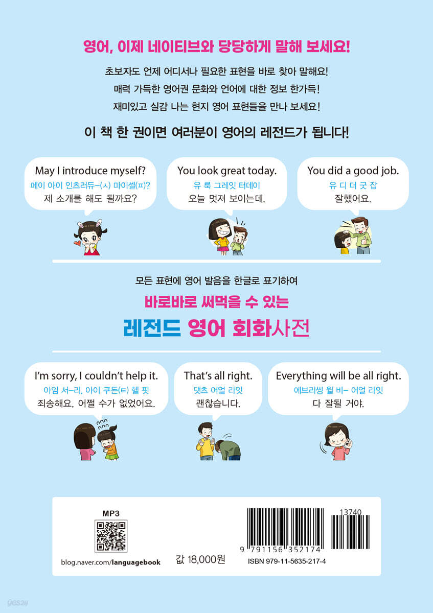 1. 상황에 따른 5000여 개 표현! 왕초보부터 초·중급 수준의 영어 학습자를 위한 어휘·표현집으로, 일상생활에서 자주 접하게 되는 상황을 12개의 큰 주제로 묶고, 다시 500개 이상의 작은 주제로 나눠 5,000여 개의 표현을 제시했습니다. 2. 눈에 쏙 들어오는 그림으로 기본 어휘 다지기! 500여 컷 이상의 일러스트와 함께 기본 어휘를 쉽게 익힐 수 있습니다. 자기소개, 직장생활 등 일상생활에 필요한 기본 단어부터 취미, 감정 등 주제별 주요 단어와 어휘를 생생한 그림과 함께 담았습니다. 3. 바로 찾아 바로 말할 수 있는 한글 발음 표기! 기초가 부족한 초보 학습자가 영어를 읽을 수 있는 가장 쉬운 방법은 바로 한글로 발음을 표기해 두는 것입니다. 영어 발음이 우리말과 일대일로 대응하지 않지만, 여러분의 학습에 편의를 드리고자 미국에서 사용하는 표준 발음과 가까운 소리로 한글 발음을 표기하였습니다. 초보자도 언제 어디서나 필요한 표현을 바로 찾아 다양한 문장을 구사할 수 있습니다. 각 표현의 하단에는 사전 없이 바로 이해할 수 있도록 참고 어휘를 정리해 뒀습니다. 4. 꼭! 짚고 가기?&?여기서 잠깐! 문화를 제대로 알아야 언어를 이해하기 쉽습니다. 영어권 사회, 문화 전반에 걸친 다양한 정보와 언어가 형성된 배경을 담아 억지로 외우지 않아도 표현이 가능하도록 했습니다. 우리와 다른 그들의 문화를 접하며 표현 익히는 데 재미를 더해 보세요. 5. 말하기 집중 훈련 유튜브 영상 & MP3! 이 책에는 기본 어휘부터 본문의 모든 회화 표현까지 원어민의 정확한 발음으로 녹음한 MP3 파일과 본문 영상을 제공합니다. Unit마다 QR코드를 스캔하여 영상 자료를 쉽게 찾아볼 수 있습니다. 자주 듣고 큰 소리로 따라 말하며 학습 효과를 높여 보세요. 영어, 이제 네이티브와 당당하게 말해 보세요! 영어 공부 십 몇 년이라는 말은 차마 꺼낼 수 없어요. 영어는 나랑 궁합이 맞지 않아요. ENGLISH의 E만 봐도 손발이 오그라들어요. 이런 고민이 있다면 이제는 〈레전드 영어 회화사전〉을 펴 보세요. 영어 공부, 아무리 안 했다 하더라도 십 몇 년의 경력(?)은 누구나 갖고 있을 것입니다. 새해가 되면 영어 공부 한번 제대로 해 보자는 신년 결심 때문에 샀던 영어 교재 몇 권이 책꽂이를 차지하고 있을지 모르겠습니다. 그렇지만 실제 우리는 영어를 써먹을 상황이 많습니다. 외국으로 여행을 가거나 업무차 해외 출장을 가기도 하고, 때론 외국에 거주하기도 합니다. 이도 저도 아니라면 한국에서 외국인 친구를 사귀게 되거나 길을 물어보는 외국인을 만나게 될 수도 있습니다. 이런 상황마다 애써 시선을 피하며 도망가기만 했다면 이제는 〈레전드 영어 회화사전〉과 함께 당당하게 설 수 있습니다. 〈레전드 영어 회화사전〉에서는 영어권 문화와 상황을 중심으로 필요한 표현 들을 모았습니다. 그곳에서만 쓰이고 꼭 필요한 표현만 추리고 우리말로 단순히 옮긴 표현은 버렸습니다. 영어를 잘하기 위해 어려운 말을 구사하려고 애쓰지 마세요. 쉬운 말이라도 내 입 밖으로 꺼내는 것이 중요합니다. 여러분에게 영어의 자신감을 더해 줄 수 있도록 모든 영어 표현에 한글 발음 표기를 달았습니다. 최대한 원어민의 발음에 가깝도록 한글로 표기하여 필요한 표현을 구사할 수 있도록 했습니다. 귀여운 그림과 함께 기본 어휘도 쉽게 익힐 수 있도록 했습니다. |