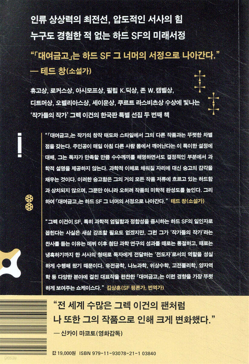 그렉 이건이 SF, 특히 과학적 엄밀함과 정합성을 중시하는 하드 SF의 일인자로 꼽힌다는 사실은 새삼 강조할 필요도 없겠지만, 그런 그가 ‘작가들의 작가’라는 찬사를 듣는 이유는 데뷔 이후 첨단 과학 연구의 성과를 때로는 통절하고, 때로는 냉혹하기까지 한 서사의 형태로 독자에게 전달하는 ‘전도자’로서의 역할을 성실하게 수행해 왔기 때문이다. 유전공학, 나노과학, 위상수학, 고전물리학, 양자역학 등 다양한 분야에 걸친 대표작을 편찬한 『대여금고』는 이런 경향을 가장 뚜렷하게 보여주는 쇼케이스다. - 김상훈 (번역가, SF 평론가)