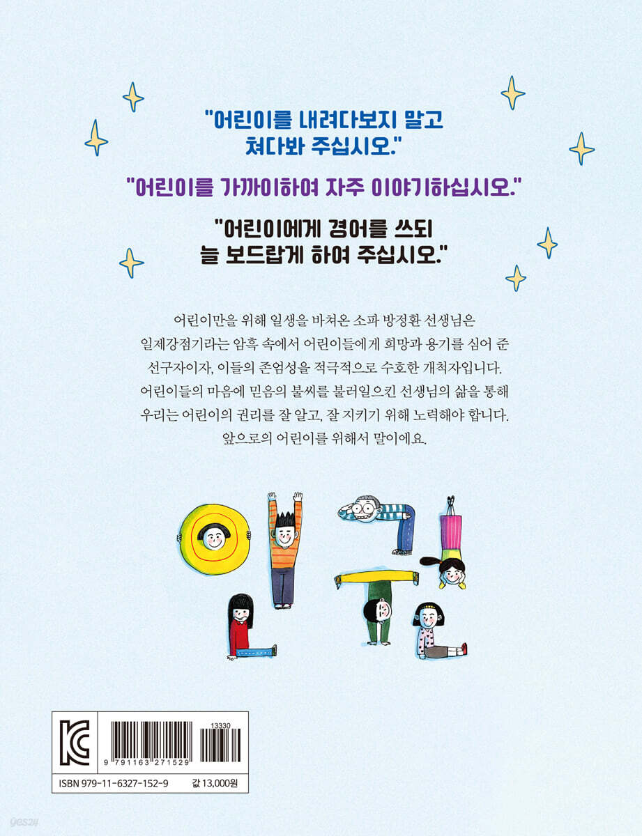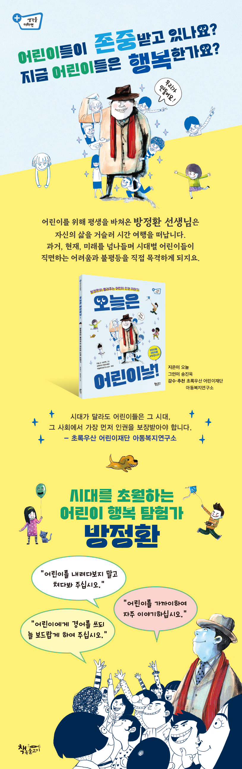 방정환 선생님의 마지막 말 인권이란 ‘사람이라면 누구나 마땅히 누려야 하는 권리’를 말해요. 남자든 여자든, 미국인이든 한국인이든, 재산이 많든 적든 상관없이 태어날 때부터 똑같이 갖는 권리이지요. 그중에서도 어린이는 가장 먼저 인권을 보장받아야 해요. 마치 여린 싹이 처음 나왔을 때, 농부가 거센 비바람과 따가운 햇볕을 가려 주는 것처럼 미래의 희망인 어린이의 권리는 누구보다 먼저 보장되어야 하는 것이지요. 어린이 인권의 선구자 방정환 선생님의 어린이 사랑은 유별났어요. 이들을 존중하는 마음을 담아 ‘어린이’라는 존칭어를 처음 만들어 불러 주셨고, 어린이 운동 단체 ‘색동회’, 최초의 어린이 잡지 「어린이」를 창간해 힘든 시대적 상황에서도 결연한 의지를 내뿜으며 어린이가 행복한 세상을 만들기 위해 노력했어요. 어린이들의 권리, 지금도 충분하다고요? 어린이들의 인권을 말하기 시작한 것은 사실 얼마 되지 않았어요. 하지만 어린이 인권의 역사를 살펴보면 100년 전보다 50년 전이 낫고, 50년 전보다는 20년 전이, 그리고 20년 전보다는 지금이 나아요. 방정환 선생님처럼 어린이를 위해 애써 온 사람들이 있어서 건강하고 안전하게 자랄 권리, 차별을 받지 않을 권리, 폭력으로부터 보호받을 권리 등 어린이의 권리를 조금씩 지켜올 수 있었지요. 하지만 내가 배고프지 않고, 학교에 잘 다니고 있다고 해서 모든 어린이가 그런 것은 아니에요. 생각하지 못한 곳에 아파하는 어린이들이 아직 있거든요. 아주아주 어린아이들에게 힘든 일을 시키는 나라도 있고, 가느다란 어린이의 손에 총을 쥐여 주는 나라도 있대요. 당당하게, 용감하게! 내가 나를 존중하는 법 1930년대 일제 강점기에는 식민 지배를 받으며 차별을 겪고, 1950년대에는 전쟁 때문에, 1960~1970년대에는 돈 때문에 어린이의 권리를 보장받지 못했지요. 책에는 시대별로 보장받지 못했던 어린이의 권리를 짚어 보여 주고 있지만, 그 시대에만 해당하는 것은 아니에요. 나라에 전쟁과 같은 큰일이 일어났을 때, 어린이의 권리를 지켜 주지 못하고 뒤로 물러서게 되는 경우도 많거든요. 우리는 우리의 권리를 잘 알고, 만약 권리가 침해되는 일이 생긴다면 당당히 권리를 주장할 수 있어야 해요. 내 의견을 표현하는 것도 어린이 권리 중 하나예요. 이렇게 우리의 권리를 지키고, 어른이 되어서도 어린이의 권리를 지킨다면 방정환 선생님이 꿈꾸던 어린이가 행복한 세상을 만날 수 있을 거예요. |