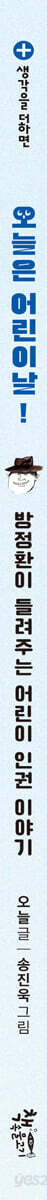 1장. 어린이날이 없어졌다고? 일제 강점기에 우리 어린이는 어땠을까? 어린이 인권-어린이가 누려야 할 권리, 어린이 인권! 2장. 비극은 하루빨리 끝나야 한다 전쟁 전후 우리 어린이는 어땠을까? 어린이 인권-어린이가 평화롭고 안전하게 살아갈 권리 3장. 월사금이 너무해 우리나라 어린이는 어떻게 학교에 다녔을까? 어린이 인권-어린이가 교육받을 권리 4장. 꿈을 싣고 돌아가는 재봉틀 일하는 어린이들의 인권은 어땠을까? 어린이 인권-어린이가 일하지 않고 쉴 권리 5장. 달그락, 도시락 건강하고 씩씩한 어린이 어린이 인권-어린이가 건강하게 자랄 권리 6장. 혼자 날리는 종이비행기 우리나라 어린이는 폭력에서 자유로울까? 어린이 인권-어린이가 폭력을 당하지 않을 권리 7장. 모두가 살색! 모두 다르면서 같은 우리 어린이 인권-어린이가 차별받지 않을 권리 8장. 내가 원하는 건요 어린이도 비밀이 있어요 어린이 인권-어린이의 사생활 보호와 의사 표현 권리 9장. 어린이가 행복한 나라 어린이의 목소리에 귀를 기울여 주세요 어린이 인권-어린이가 자신과 관련된 일에 참여할 권리 어린이들의 친구 소파 방정환 유엔아동권리협약 |