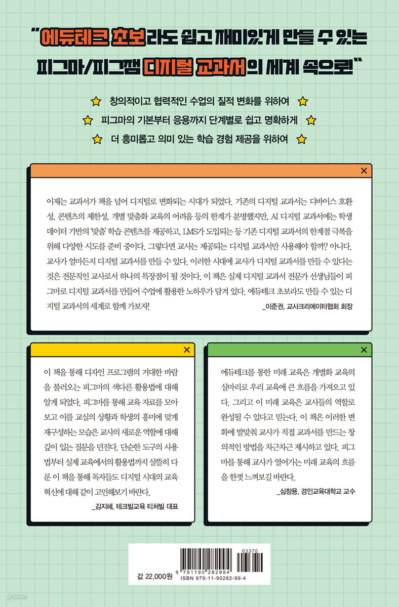 “에듀테크를 통한 미래 교육은 개별화 교육의 실마리로 우리 교육에 큰 흐름을 가져오고 있다. 그리고 이 미래 교육은 교사들의 역할로 완성될 수 있다고 믿는다. 이 책은 이러한 변화에 발맞춰 교사가 직접 교과서를 만드는 창의적인 방법을 차근차근 제시하고 있다. 피그마를 통해 교사가 열어가는 미래 교육의 흐름을 한껏 느껴보길 바란다.” - 심창용 (경인교육대학교 교수)