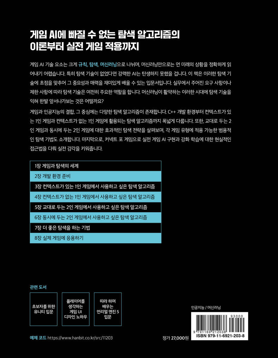 과거 스타크래프트 전성기였던 초등학생 시절, 다수의 컴퓨터를 상대하여 혼자서 몇 대나 이길 수 있는지를 기준으로 등급을 가렸던 기억이 납니다. 초보 플레이어일 때는 한 대만 상대하기에도 벅찼지만, 경험이 쌓이다 보면 인공지능의 전략적 취약점을 발견하게 되고 그 부분을 집중 공략하면 3~4대를 상대해도 어느 정도 우위를 점할 수 있었습니다. 지금의 게임 AI는 과거에 비해 수준이 압도적으로 상승했고, 일부 분야는 오히려 사람이 AI로부터 전술을 배워야 하는 단계가 되었습니다. 아무리 컴퓨터의 계산 능력이 좋다고 하더라도, 모든 경우의 수를 전수조사하는 방법은 결코 효과적일 수 없습니다. 결국 비교적 유망한 경로를 조기에 결정하고 나머지 다른 가능성을 포기하며 실수를 감수하는 냉철한 판단이 요구되며, 이를 탐색 알고리즘에 대한 최적화 문제로 접근할 수 있습니다. 이 책은 게임 인공지능을 위한 탐색 알고리즘의 A to Z를 다루는 유일무이한 책입니다. - 박재유 (LG전자 선임 연구원)