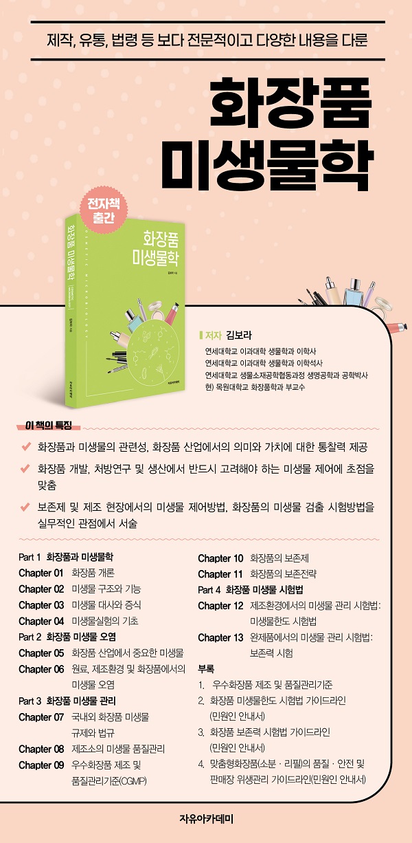 화장품은 화학, 생물학의 기초과학을 기반으로 계면화학, 피부과학, 감성학 등이 어우러진 융합과학의 산물이라고 할 수 있습니다. 그동안 화장품의 계면화학이나 피부과학 등에 대해서는 여러 저서가 출간되었으나 화장품 관점에서 쓰여진 미생물 관련 서적은 현재 국내에는 거의 없는 상황입니다. 이에 이 책을 통해 화장품과 미생물은 어떤 관련이 있으며 또한 화장품 산업에서 어떤 의미와 가치가 있는지에 대한 통찰력을 제공하고자 하였습니다. 미생물학은 기초지식과 전문지식으로서 매우 방대한 내용이지만, 이 책에서는 화장품 개발에서 미생물 오염과 관련되는 내용 및 화장품 처방연구 및 생산에서 반드시 고려되어야 하는 미생물 제어와 관련하여 초점을 맞추었습니다. 즉, 화장품의 자체 보존력을 높이고 첨가한 보존제의 활성을 유지하기 위한 방법, 피부에 안전한 보존제 선택, 화장품의 위생적인 제조 및 생산을 위해 제조현장에서의 미생물 제어방법 그리고 화장품의 미생물 검출 시험방법을 실무적인 관점에서 다루었습니다. 유익한 책이 되도록 최선을 다하였지만 미흡한 부분에 대해 양해를 바라며 출간 후 나올 수 있는 수정사항 등은 자유아카데미 홈페이지(www.freeaca.com) 자료실에 제공할 예정이니 참고하기를 바랍니다. 부디 이 책이 화장품 산업에 종사하는 미생물 담당자들과 화장품에 대해 배우는 학생들에게 도움이 되기를 바라는 바입니다. 이 책이 나오기까지 도움을 주신 ㈜마이크로월드 서경희 사장님, ㈜아모레퍼시픽 안수선 박사님, ㈜엑티브온 정성원 상무님, 김예린, 이윤서, 이주연 대학원 학생들에게 진심으로 감사드립니다. 탈고를 위해 집중할 수 있는 환경을 제공하고 기도해주신 웨인주립대학교 전현주 교수님과 이지영 박사님 그리고 저의 삶의 목적과 존재의 이유가 되는 사랑하는 가족과 주님께 깊이 감사드립니다. 마지막으로 책이 나오기까지 많은 도움을 주신 자유아카데미 관계자분들께 진심 어린 감사의 말을 전합니다. |