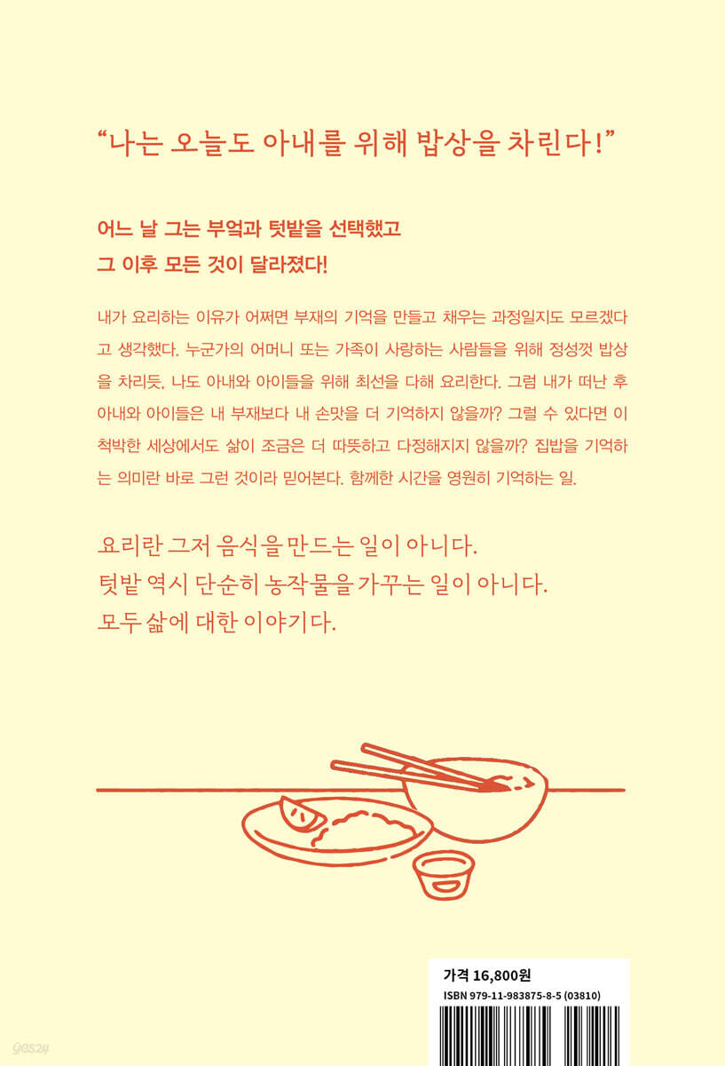 이 책이 누군가에게는 대리만족이 되고 누군가에겐 갈증이 될 수도 있겠다. 왜 저렇게 사나, 한심하게 보일 수도 있다. 어쨌거나 어느 날 난 선택했고 그 이후 모든 것이 변했다. 아내가 변하고 가족이 변하고 무엇보다 내가 변했다. 생계 수단에 불과했던 밥상 위에 얼마나 많은 가치와 의미가 있는지 깨닫기도 했다. 선택은 늘 그렇듯 기적을 만들어낸다. 요리란 그저 음식을 만드는 일이 아니다. 텃밭 역시 단순히 농작물을 가꾸는 일이 아니다. 모두 삶에 대한 이야기다. 사람과 사람을 이어주고 사람과 자연을 이어주는 일이다. 살림은 사람을 살리는 일이다. 사소한 일상이 얼마나 소중하고 가치 있는지 깨닫게 해주는 일이다. 나는 살림을 하면서, 요리를 하면서, 김서령 작가가 말하는 삶의 맛이 무엇인지 깨달았다. 행복이 어떻게 우리를 찾아오는지 느낄 수 있었다. 여기에 실린 얘기는 그런 얘기들이다. 맛이 아니라 삶을 요리하는 레시피. 행복을 찾기 위한 레시피다. 모두가 나름의 레시피를 찾아 행복하기를 빌어본다. --- 「들어가는 글_ 삶의 레시피를 찾아서」중에서 아내가 발을 다친 후 진짜 음식을 만들어보겠다고 들어온 부엌은 말 그대로 정글이었다. 한 치 앞이 보이지 않았다.냉장고에 호박이 보였다. 호박볶음을 해야 하나? 아니면 호박국? 인터넷에서 보니 새우젓이 필요하다던데 그건 어디 있지? 이 하얀 가루는 어디에 쓰는 걸까? 다진 마늘은 또 어디? 밥이 잡곡이던데 잡곡은 어디에 두지? 이것도 아내한테 물어봐야 하나? 모르긴 몰라도 중년 남자들이 요리에 도전하고 싶어도 쉽사리 덤벼들지 못하는 이유가 여기에 있을 것이다. 어디부터 손대야 할지 모를 막막함. 미지의 세계는 늘 두려운 법이다. 요컨대 한 번도 가보지 못한 세상에 발을 디민 것이다. 애초에 자취와 살림은 차원부터가 다르다. 대충 요리해서 내 한 입 챙기는 것과 온 가족의 입맛에 맞게 매일매일 새로운 메뉴를 만들어 대령하는 일이 어찌 같겠는가. 살림은 사람을 살리는 일이다. 누군가의 헌신을 연료로 사랑하는 사람들을 살리는 일. 그래서 살림이건만 그저 밥, 반찬 몇 개 만들고 청소하고 설거지 정도로 생각해 왔다. (…중략…) 아내와의 약속을 지키기 위해,부엌,아니 주방에 들어가고 며칠 후,퍼뜩 머릿속에 떠오른 생각은 “망했다”였다. 번역일만으로 하루가 빡빡한데 거기에 살림까지?아내가 다쳤어도,아내한테 아무리 미안하고 고마운 마음이 들어도 그냥 먼 산 바라보며 ‘생깠어야’ 했다.물론,아내도 내가 사나흘 끙끙거리다 포기하리라고 생각했을 것이다. 당연하잖아! 다른 것도 아니고 살림인데! 이건 남자가 할 일이 못 돼. 절대로! --- 「살림은 아무나 하나」중에서 제일 기억나는 음식이 날달걀비빔밥이다. 비빔밥이라고 해봐야 그저 더운 밥 위에 날달걀 하나와 조선간장 한 수저 넣고 비벼 먹는 데 불과했다. 내 나이 다섯 살에 어머니가 집을 나간 후 어린 동생들을 돌보던 누이가 자주 해주던 음식이었다. 시골이라 다들 닭을 키웠기에 달걀 구하기가 그렇게 어렵지는 않았을 것이다. 프라이가 아니라 날달걀인 이유는 식용유든 돼지기름이든 어린 누나에게는 사기도 다루기도 만만치 않았지 싶다. (…중략…) “맛있는 음식에는 노동의 땀과 나누어 먹는 즐거움의 활기, 오래 살던 땅, 죽을 때까지 언제나 함께 사는 식구, 낯설고 이질적인 것과의 화해와 만남, 사랑하는 사람과 보낸 며칠, 그리고 가장 중요하게는 궁핍과 모자람이라는 조건이 들어 있으며, 그것이 맛의 기억을 최상으로 만든다.” 황석영의 말이다. 날달걀비빔밥은 그러니까 내 “궁핍과 모자람”의 상징인 셈이다. 난 지금도 종종 날달걀비빔밥을 만들어 먹는다. 안 하는 요리는 있어도 못 하는 요리는 없다고 큰소리치는 요즘이지만 기억의 맛은 어느 산해진미보다 유혹이 강하다. 그 역시 양은 도시락이나 밀가루 소시지와 같은 기억의 맛이겠지만 차이가 있다면 날달걀비빔밥만큼은 당시의 맛을 그대로 돌려준다. 이 음식으로 소환해야 할 기억이 가난, 외로움밖에 없어서일까? 지금도 그때처럼 나 혼자만 먹어야 하는 음식이어서? 아내와 아이들이 싫어하는 게 어쩌면 다행이다 싶기도 하다. 그들에게 외롭고 가난한 기억이 없다는 뜻이니까. --- 「날달걀비빔밥」중에서 집에서 가족을 위해 음식을 해본 사람은 안다. 흔히 집밥이라 부르는 하찮은 음식이 사실은 얼마나 다양하고 복잡하며 그 음식을 제대로 만들려면 얼마나 많은 노력과 고민과 전문 기술이 필요한지. 일류 요리사들이야, 전문 분야 몇 가지만 숙달하면 그만이지만, 집밥은 말 그대로 뫼비우스의 띠 같은 세상이다. 출판번역을 이십 년 붙들고, 야생화를 십오 년 이상 쫓아다니고, 텃밭 재배를 십 년 넘게 했지만, 집밥만큼 고급 기술이 필요한 일은 단연코 없었다. 게다가 집밥이야말로 사랑하는 사람들을 먹여 살리는 일이 아닌가. 그런데도 부엌일을 하찮게 여기고 “집에서 밥이나 하는 여자들” 운운하다니! 그러면서도 인기 좋은 요리사는 죄다 자기들 남자 차지다. 난 그 자리에서 그간 장난처럼 써 오던 붥덱을 내 별명이자 아호로 정해버렸다. 요컨대,여자들