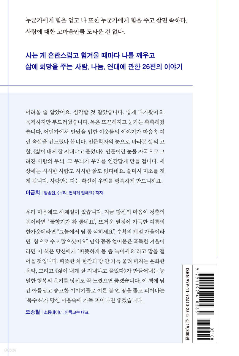우리 마음에도 사계절이 있습니다. 지금 당신의 마음이 청춘의 봄이라면 “꽃향기가 참 좋네요”, 뜨거운 열정이 가득한 여름의 한가운데라면 “그늘에서 땀 좀 식히세요”, 수확의 계절 가을이라면 “참으로 수고 많으셨어요”, 만약 꽁꽁 얼어붙은 혹독한 겨울이라면 이 책은 당신에게 “따뜻하게 몸 좀 녹이세요”라고 말을 걸어올 것입니다. 따뜻한 차 한잔과 방 안 가득 울려 퍼지는 온화한 음악, 그리고 『삶이 내게 잘 지내냐고 물었다』가 만들어내는 농밀한 행복의 온기를 당신도 꼭 느꼈으면 좋겠습니다. 이 책에 담긴 아름답고 숭고한 이야기들로 이른 봄 언 땅을 뚫고 피어나는 ‘복수초’가 당신 마음속에 가득 피어나면 좋겠습니다. - 오종철 (소통테이너, 안목고수 대표)