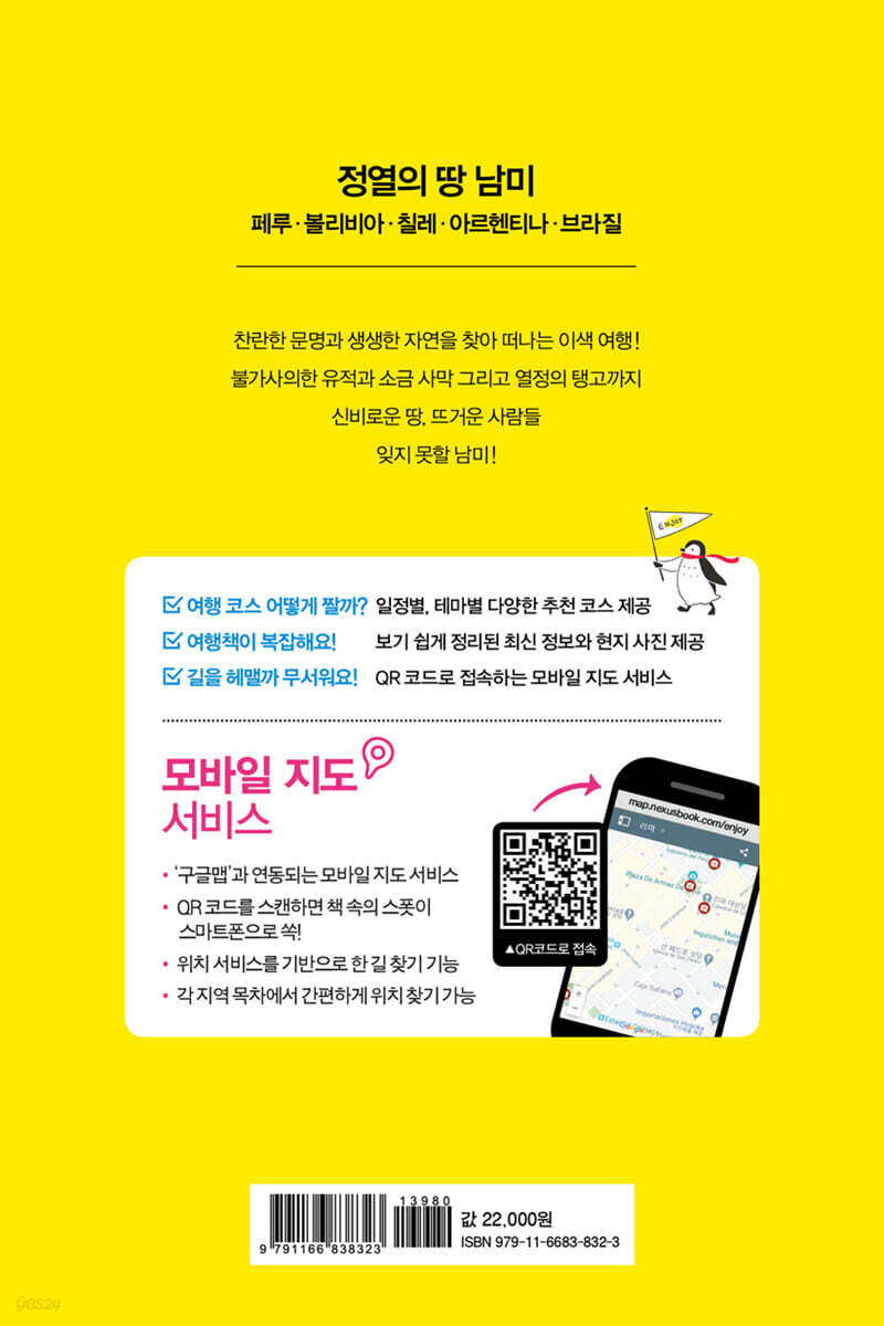 - 여행 전문가가 직접 두 발로 뛰어 취재한, 완벽한 최신 여행 가이드북! - 각 나라별 베스트 여행지와 지역 특색을 고려한 맞춤 코스 수록! - 각양각색의 매력이 넘치는 남미 주요 도시의 상세한 정보! - 남미를 여행한다면 놓치지 말아야 할 투어 정보가 가득! - 여행의 편의를 높여 줄 도시별 상세 지도와 교통 정보! - 구글맵을 기반으로 편안한 길 찾기가 가능한 모바일 지도 서비스 제공! ■ 이 책의 구성 남미 Best 여행지 12 남미를 여행할 때 놓치지 말아야 하는 추천 장소를 정리했다. 남미 여행을 준비할 때는 이곳을 중심으로 여행 일정을 잡는 것을 추천한다. 남미 추천 코스어디부터 여행을 시작할지 고민이 된다면 추천 코스를 살펴보자. 저자가 추천하는 코스를 참고하여 자신에게 맞는 최적의 일정을 세워 본다. 남미 여행 준비 여행 시기를 결정하는 데 중요한 기후와 축제 정보부터 여행 준비 과정에서 필요한 비자, 예약, 준비물 등의 다양한 정보를 담았다. 남미 입출국하기 남미 여행의 시작과 끝인 입출국에 관한 정보를 자세히 담았다. 지역 여행 남미의 각 지역별 주요 관광지와 투어 정보, 맛집, 숙소 등을 소개한다. 남미를 찾는 여행자라면 꼭 가 봐야 할 핵심 여행 정보 위주로 정리하였다. 여행 회화 현지에서 사용할 수 있는 간단한 스페인어와 포르투갈어 회화 표현을 수록하였다. 찾아보기 이 책에서 소개된 곳들을 관광지, 투어, 음식점, 숙소 등 주제별 목록으로 정리하여 이름만 알아도 쉽게 찾을 수 있도록 하였다. 책에 나온 장소를 내 휴대폰 속으로! 여행 중 길 찾기가 어려운 독자를 위한 인조이만의 맞춤 지도 서비스. 구글맵 기반으로 새롭게 돌아온 모바일 지도 서비스로 스마트하게 여행을 떠나자~ 인조이가 항상 당신의 편안한 여행을 응원합니다. 하나, ‘구글맵’과 연동되는 모바일 지도 서비스 둘, QR 코드를 스캔하면 책 속의 스폿이 스마트폰으로 쏙! 셋, 위치 서비스를 기반으로 한 길 찾기 기능 넷, 각 지역 목차에서 간편하게 위치 찾기 가능 *모바일이나 PC에서 사용할 수 있습니다. |