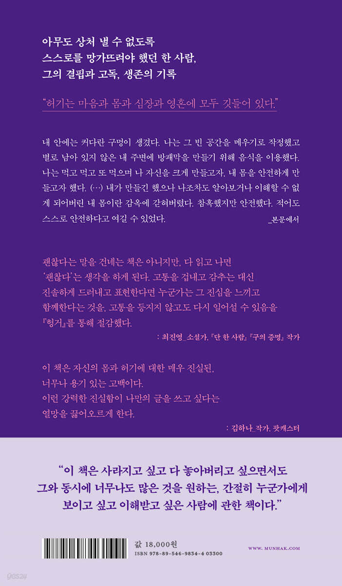 괜찮다는 말을 건네는 책은 아니지만, 다 읽고 나면 ‘괜찮다’는 생각을 하게 된다. 고통을 겁내고 감추는 대신 진솔하게 드러내고 표현한다면 누군가는 그 진심을 느끼고 함께한다는 것을, 고통을 등지지 않고도 다시 일어설 수 있음을 『헝거』를 통해 절감했다. - 최진영 (작가,『단 한 사람』 『구의 증명』 저자)