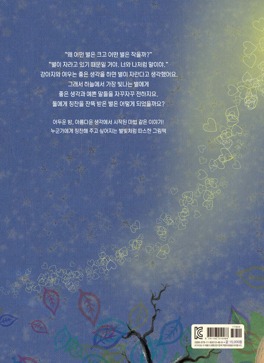가장 아름다운 별을 만들어요! 강아지와 여우는 생각하고 또 생각합니다. “별들도 우리처럼 뭘 먹을까?” “별이 먹는 건 아마 다른 걸 거야. 네가 별을 바라보면서 좋은 생각을 하면, 별이 자라는 거지.” 우리가 좋은 말을 들으면 자라나는 기분이 들듯이, 별들도 좋은 생각과 말을 듣고 커다란 별로 자라난다는 사랑스러운 생각. 이 생각을 강아지와 여우는 곧장 실천에 옮깁니다. “별아, 너 참 아름답구나!”, “오늘따라 반짝이는 게 무척 예쁘구나!” 하는 기분 좋은 생각을 별에게 계속 전해주지요. 별은 무럭무럭 자라납니다. 강아지와 여우를 비롯해 숲속 동물들도 나무에 옹기종기 붙어서 점점 더 환히 빛나는 별을 구경했죠. 그런데 그때, 별이 갑자기 아래로 떨어지기 시작하는 게 아니겠어요? 칭찬을 너무 많이 했던 게 문제인 걸까요? 여우는 놀라고 속이 상해 울음을 터뜨립니다. 하지만 강아지는 가만히 생각합니다. 그러곤 살며시 미소를 지으며 여우를 안심시킵니다. 별은 좋은 생각과 말들을 잘 받아준 거였다고요. 강아지가 이렇게 말한 이유는 무엇일까요? 순수한 여우와 지혜로운 강아지가 펼치는 이야기를 찬찬히 따라가 보아요. 가장 빛나는 별을 더 아름답게 만들어 주려는 따듯한 마음, 그리고 별이 칭찬을 먹고 자란다는 사랑스러운 생각에 미소 짓게 될 거예요. 특히, 칭찬을 듣고 정말로 별이 자라나는 이야기는 한마디 칭찬의 힘을 보여 줍니다. “좋은 말은 가슴을 뛰게 하고, 행복한 미소를 짓게 하며, 벅찬 감동을 느끼게 해 줍니다. 칭찬의 말을 들으면 하루 종일 기분이 좋고, 나도 누군가를 칭찬하고 싶다는 생각이 들게 합니다.” 이 책을 옮긴 번역가의 말처럼, 좋은 말과 칭찬이 가져다주는 효과가 실로 엄청나다는 걸 느낄 수 있을 거예요. 우리도 오늘 누군가에게 한마디 칭찬을 건네 보는 건 어떨까요? 세심하고 따듯한 호기심이 빚어낸 빛나는 상상력! 《세상에서 가장 빛나는 별》은 자연에 대한 세심한 관찰력이 돋보이는 그림책이에요. 첫 장면부터 고요한 숲속 밤 풍경을 자세하게 묘사하여, 마치 강아지와 여우와 함께 숲속에 있는 것처럼 느껴져요. 숲속 풍경뿐만 아니라 밤하늘도 마찬가지예요. 별의 크기와 밝기를 섬세하게 그려내, 강아지와 여우가 별을 자라게 하려는 과정에서 별의 일생을 살펴보는 것 같은 느낌이 들어요. 이 책을 쓴 네덜란드 작가 다니엘 쇼도르스트는 가까운 것에서 이야깃거리를 찾는 걸 즐긴다고 합니다. 작가는 어느 날 밤하늘의 별을 보다가 무릎을 탁, 치고 이 이야기를 쓴 것일지도 모르겠습니다. 밤하늘에서 종종 볼 수 있는 별을 매개로, 우리 주변에서 빛나는 소중한 것들을 놓치지 말라는 메시지를 전달하고 있으니 말이에요. 그리고 여기에 특유의 호기심과 상상력을 더해 재미난 이야기를 빚어냈어요. 이야기의 시작점이 되는 ‘별의 크기가 저마다 다른 건 왜일까?’라는 질문에 ‘우리가 자라는 것처럼 별이 자라고, 우리가 뭘 먹는 것처럼 별도 뭔가를 먹는다’로 이어지는 상상은 엉뚱하고, 황당하지만 순수한 시선을 보여 줘요. 따듯한 호기심과 상상력이 가득한 그림책을 통해, 슬며시 미소가 떠오르는 즐거움과 훈훈한 마음을 느껴 보아요. |