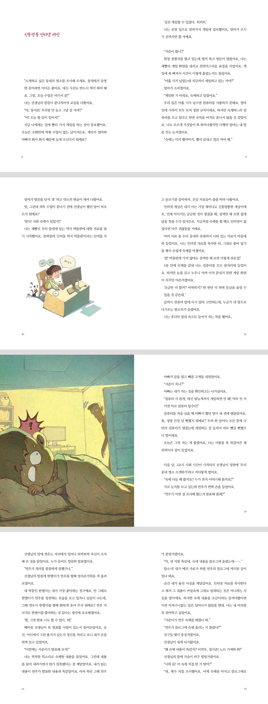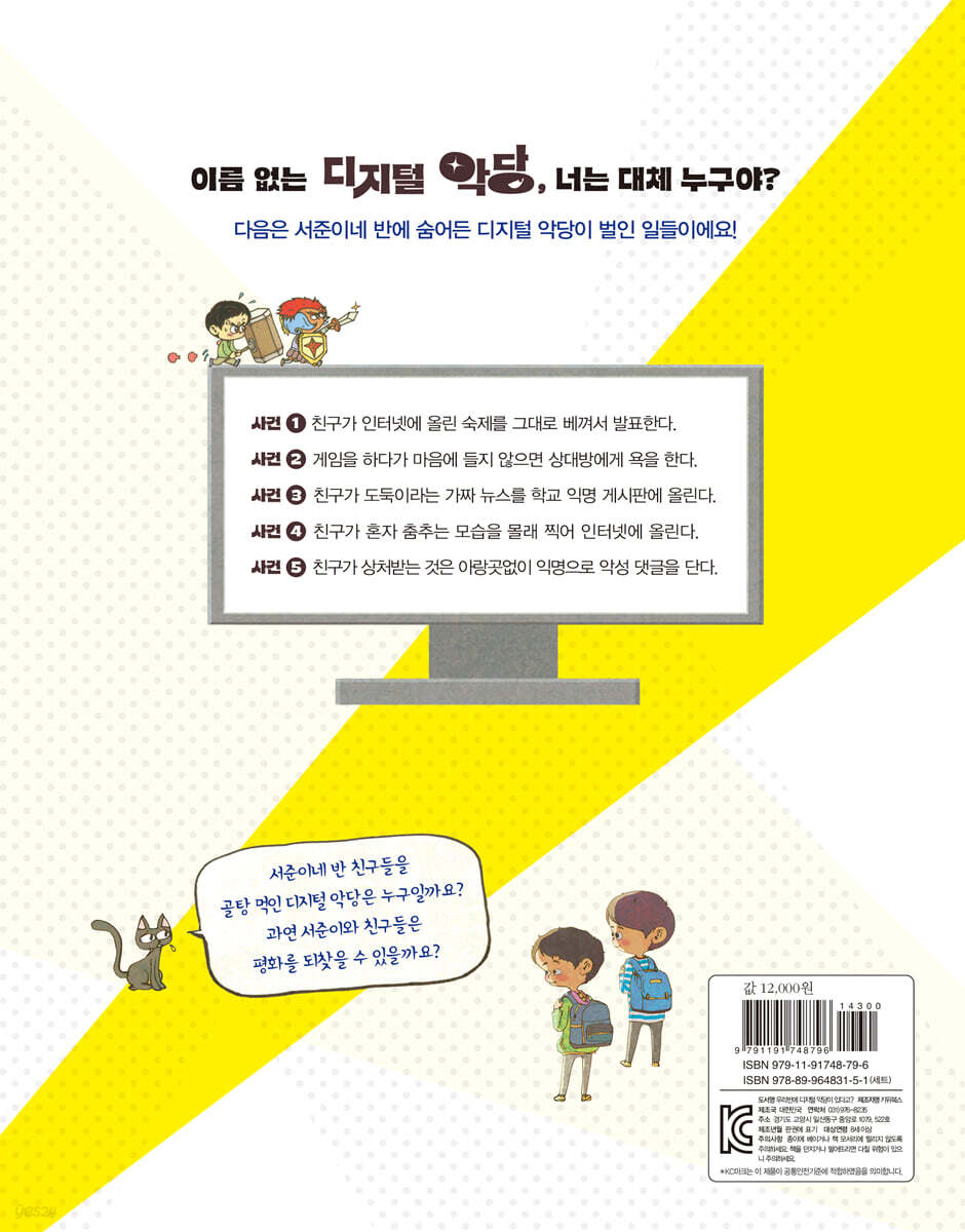 새 컴퓨터가 생긴 서준이는 가족과 함께 정한 컴퓨터 이용 시간도 어긴 채 게임 삼매경입니다. 문득 학교 숙제가 생각난 서준이는 복사, 붙여 넣기로 5분 만에 숙제를 해치운 뒤 잠이 들지요. 다음 날 수업 시간, 씩씩하게 숙제를 발표하지만 뭔가 이상합니다. 앞선 연우의 발표와 내용이 똑같았기 때문입니다. 인터넷에서 연우의 숙제를 베껴 온 사실이 드러난 서준이는 결국 선생님께 꾸중을 듣습니다. 설상가상으로 서준이는 자신의 생일날, 가장 좋아하는 친구 한별이가 연우와 함께 있는 사진을 보고 맙니다. 너무나 얄미운 연우를 골탕 먹일 계획을 세우는 서준이. 그 계획은 대체 무엇일까요? 디지털 악당이 뿌린 가짜 뉴스! 학교 익명 게시판에 ‘무인 문구점에서 물건을 훔친 아이를 보신 분은 제보 부탁합니다’라는 글이 올라옵니다. 그 글을 본 서준이의 머릿속에는 연우를 골탕 먹일 계획이 번뜩 떠오릅니다. 그러고는 학교 게시판에 무인 문구점에서 물건을 훔친 도둑이 바로 연우가 아닐까 하고 추측하는 게시물을 올리지요. 십 분도 지나지 않아 서준이네 반 단체 대화방에서 연우는 어느새 물건을 훔친 도둑이 됩니다. 다행히 진짜 도둑이 잡힌 덕분에 연우의 누명은 바로 벗겨졌지만, 화장실에서 연우의 울음소리를 들은 서준이는 죄책감에 마음이 불편합니다. 누구나 피해자가 될 수 있어 학교에 간 서준이는 모두가 휴대폰을 보며 웃고 있는 모습을 발견합니다. 친구들은 어젯밤 놀이터에서 서준이가 춤을 추고 있는 영상을 보고 있었습니다. 장기 자랑에 나가기 위해 열심히 연습하는 자신의 모습을 보고 모두 웃는 것도 서러운데 게시물에 달린 악성 댓글까지 본 서준이는 눈물이 핑 돕니다. 장기 자랑에 나갈 사람을 바꾸는 게 좋겠다는 친구들 속에서 서준이를 감싸 주는 사람은 다름 아닌 연우였습니다. 열심히 연습하면 잘할 수 있다는 따뜻한 말에 서준이는 자신이 연우에게 벌였던 일에 대한 죄책감이 더욱 커집니다. 함께 만들어 가요! 온라인 바른 생활 인터넷에서는 타인의 저작물을 마치 자기 것인 양 이용하고 타인의 개인 정보를 함부로 유포하는 등의 크고 작은 문제가 수도 없이 벌어집니다. 또 순식간에 퍼지는 가짜 뉴스와 익명으로 달리는 무분별한 악성 댓글로 사람들이 고통을 받기도 합니다. 이와 같은 일들을 방지하려면 인터넷에서 지켜야 할 예절, 네티켓을 지키는 일이 중요합니다. 어린이들이 이야기를 통해 서준이네 반에 숨은 디지털 악당이 어떻게 변화하는지를 살펴보고, 부록에서 인터넷 예절 수칙, 개인 정보 보호 방법, 사이버 폭력의 종류, 저작물 이용 수칙 등 심화된 내용까지 알아본다면 보다 안전하고 즐거운 온라인 생활을 즐길 수 있을 것입니다. |
